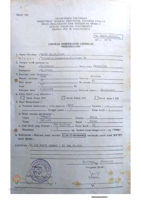 Laporan dari Balai Pengawasan dan Sertifikasi Benih II Satuan Tugas DIY tentang Hasil Pemeriksaan Lapangan Pendahuluan untuk Sertifikasi Bibit Varietas Dodokan di BB/BP Kebun Wijilan.