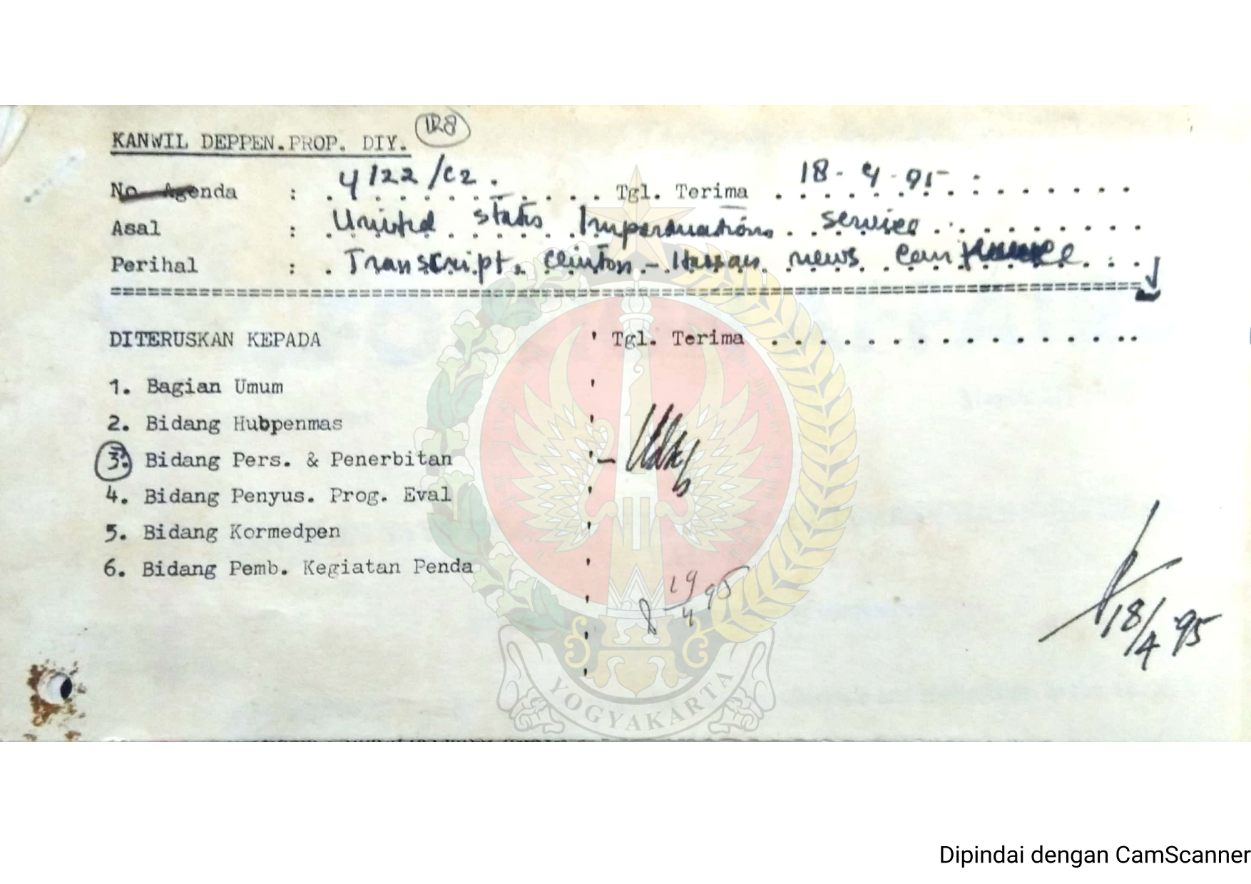 Surat dari United States Information Service perihal Transcript Clinton-Hassan News Conference yang berjudul โClinton Says Islamic, Western Cultures Share Similar Valuesโ.