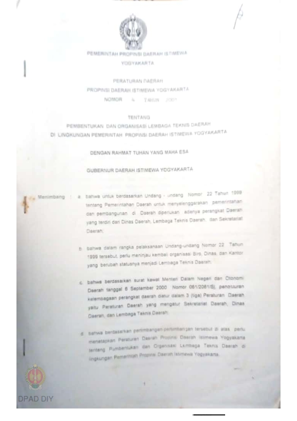 Peraturan Daerah Provinsi DIY Nomor4 tahun 2001 tentang pembentukan dan organisasi lembaga teknis Daerah di lingkungan Pemerintah Provinsi DIY.