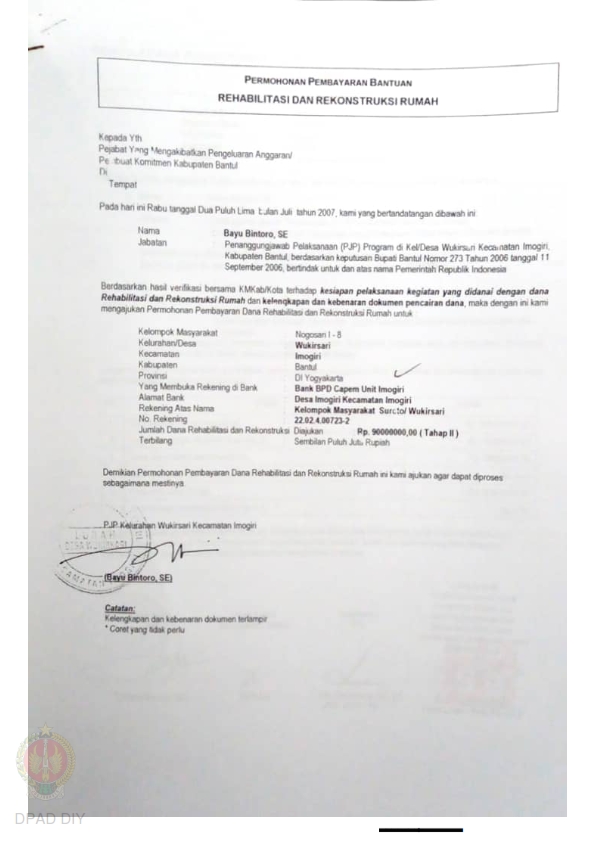 Permohonan Pembayaran Bantuan Rehabilitasi dan Rekonstruksi Rumah, Nama Kelompok Masyarakat Pandak 19, Kel/Desa Wijirejo, Kecamatan Pandak, Kabupaten Bantul, Provinsi Daerah Istimewa Yogyakarta. |