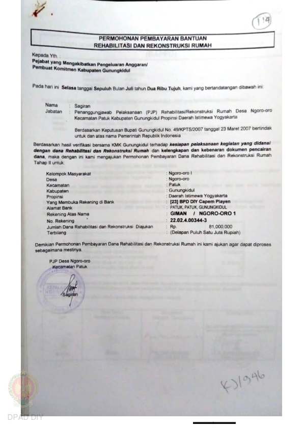 Permohonan Pembayaran Bantuan Rehabilitasi dan Rekonstruksi Rumah, Kelompok Masyarakat Ngoro oro, Kelurahan Ngoro oro, Kecamatan Patuk, Kabupaten Gunungkidul, Provinsi Daerah Istimewa Yogyakarta. |