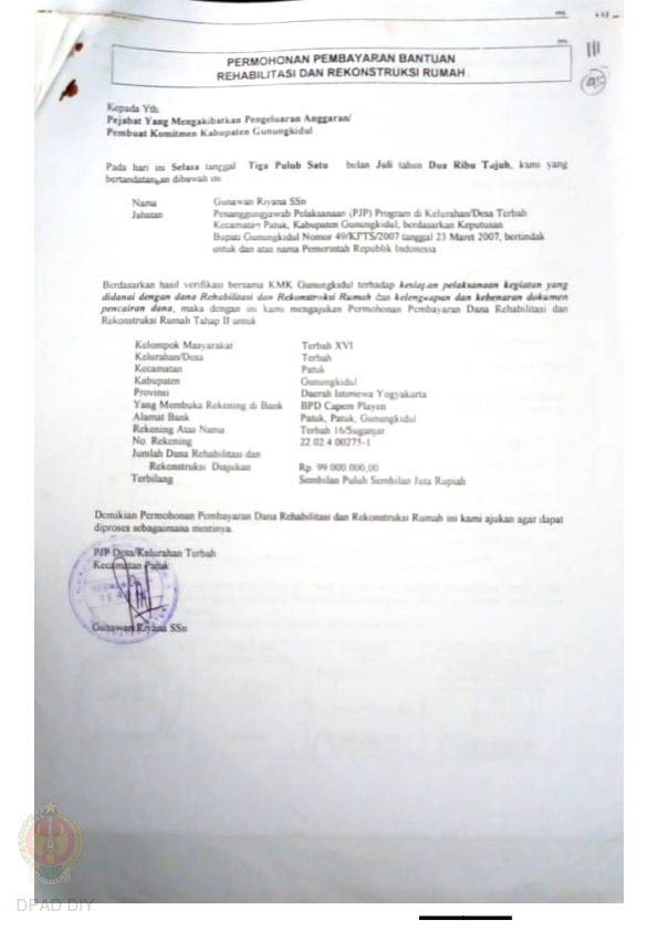 Permohonan Pembayaran Bantuan Rehabilitasi dan Rekonstruksi Rumah, Kelompok Masyarakat Terbah XVI s.d XLVIII, Kelurahan Terbah, Kecamatan Patuk, Kabupaten Gunungkidul, Provinsi Daerah Istimewa Yogyakarta. |