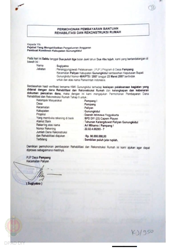 Permohonan Pembayaran Bantuan Rehabilitasi dan Rekonstruksi Rumah, Kelompok Masyarakat Pampang I dan II, Kelurahan Pampang, Kecamatan Paliyan, Kabupaten Gunungkidul, Provinsi Daerah Istimewa Yogyakarta. |