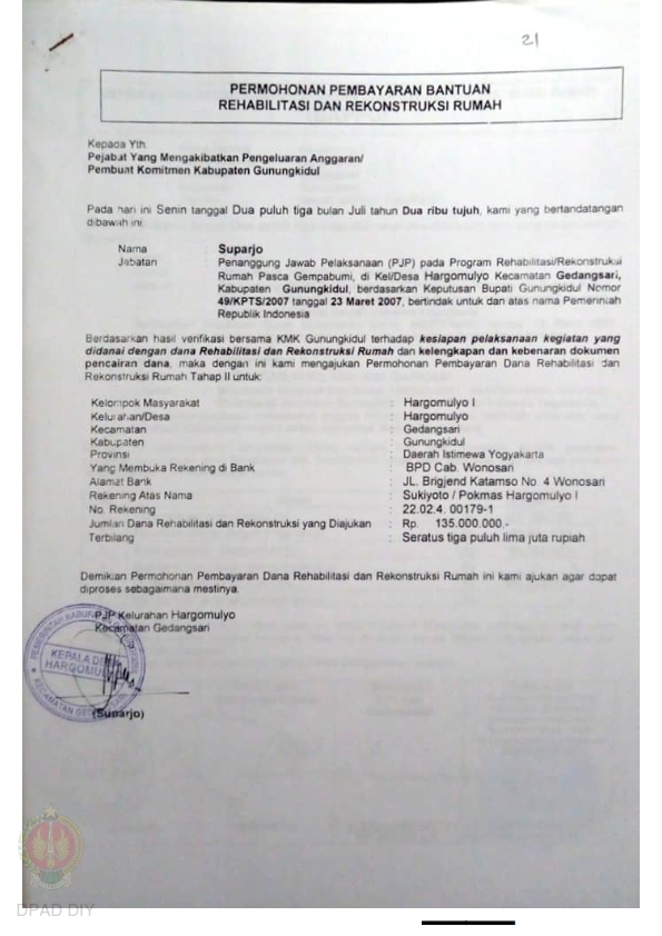Permohonan Pembayaran Bantuan Rehabilitasi dan Rekonstruksi Rumah, Kelompok Masyarakat Hargomulyo I s.d XIX, Kelurahan Hargomulyo, Kecamatan Gedangsari, Kabupaten Gunungkidul, Provinsi Daerah Istimewa Yogyakarta. |