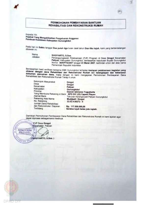 Permohonan Pembayaran Bantuan Rehabilitasi dan Rekonstruksi Rumah, Kelompok Masyarakat Grogol, Kelurahan Grogol, Kecamatan Paliyan, Kabupaten Gunungkidul, Provinsi Daerah Istimewa Yogyakarta. |