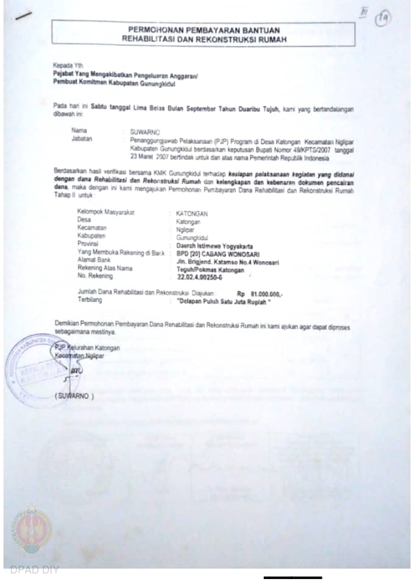 Permohonan Pembayaran Bantuan Rehabilitasi dan Rekonstruksi Rumah, Kelompok Masyarakat Sedan, Kelurahan Sidorejo, Kecamatan Lendah, Kabupaten Kulonprogo, Provinsi Daerah Istimewa Yogyakarta. . |