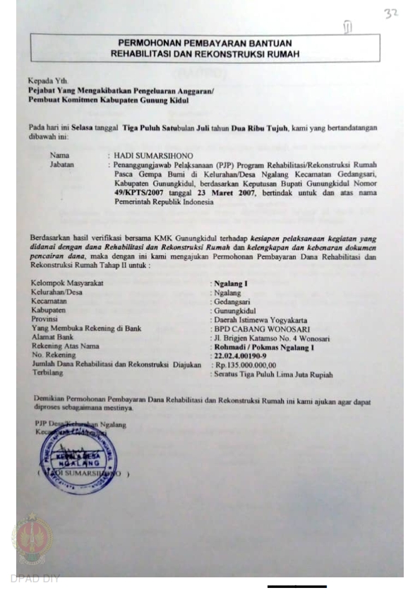 Permohonan Pembayaran Bantuan Rehabilitasi dan Rekonstruksi Rumah, Kelompok Masyarakat Ngalang I s.d XV, Kelurahan Ngalang, Kecamatan Gedangsari, Kabupaten Gunungkidul, Provinsi Daerah Istimewa Yogyakarta. |