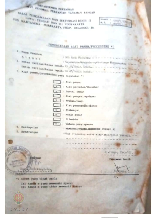 Laporan pemeriksaan alat prosesing untuk sertifikasi benih dari Balai Pengawasan dan Sertifikasi Benih II Satuan Tugas DIY
