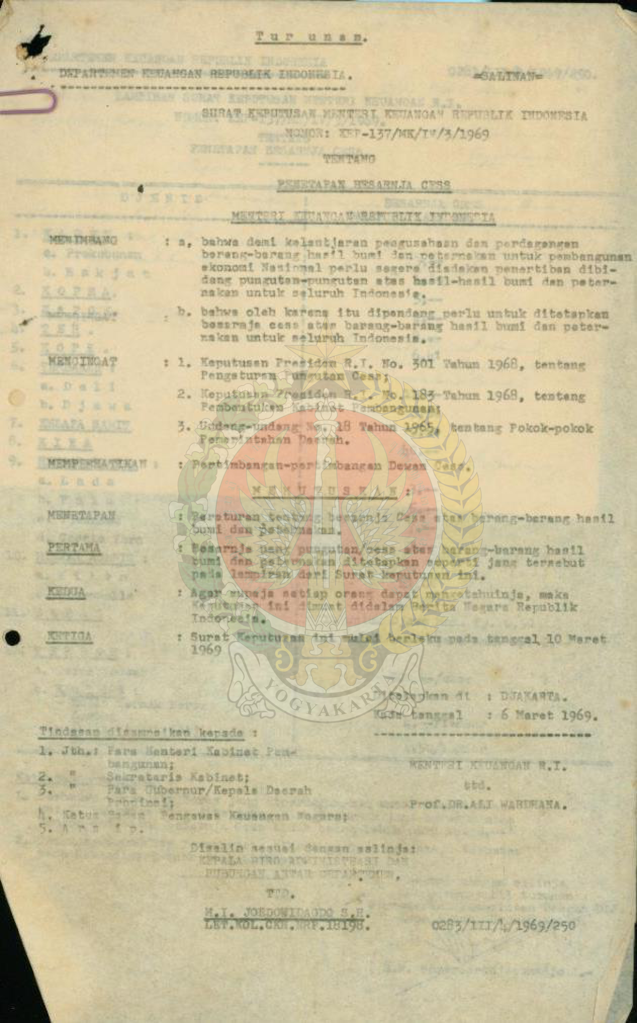 SK Menteri Keuangan tentang penetapan besarbya cess Pemda DIY.