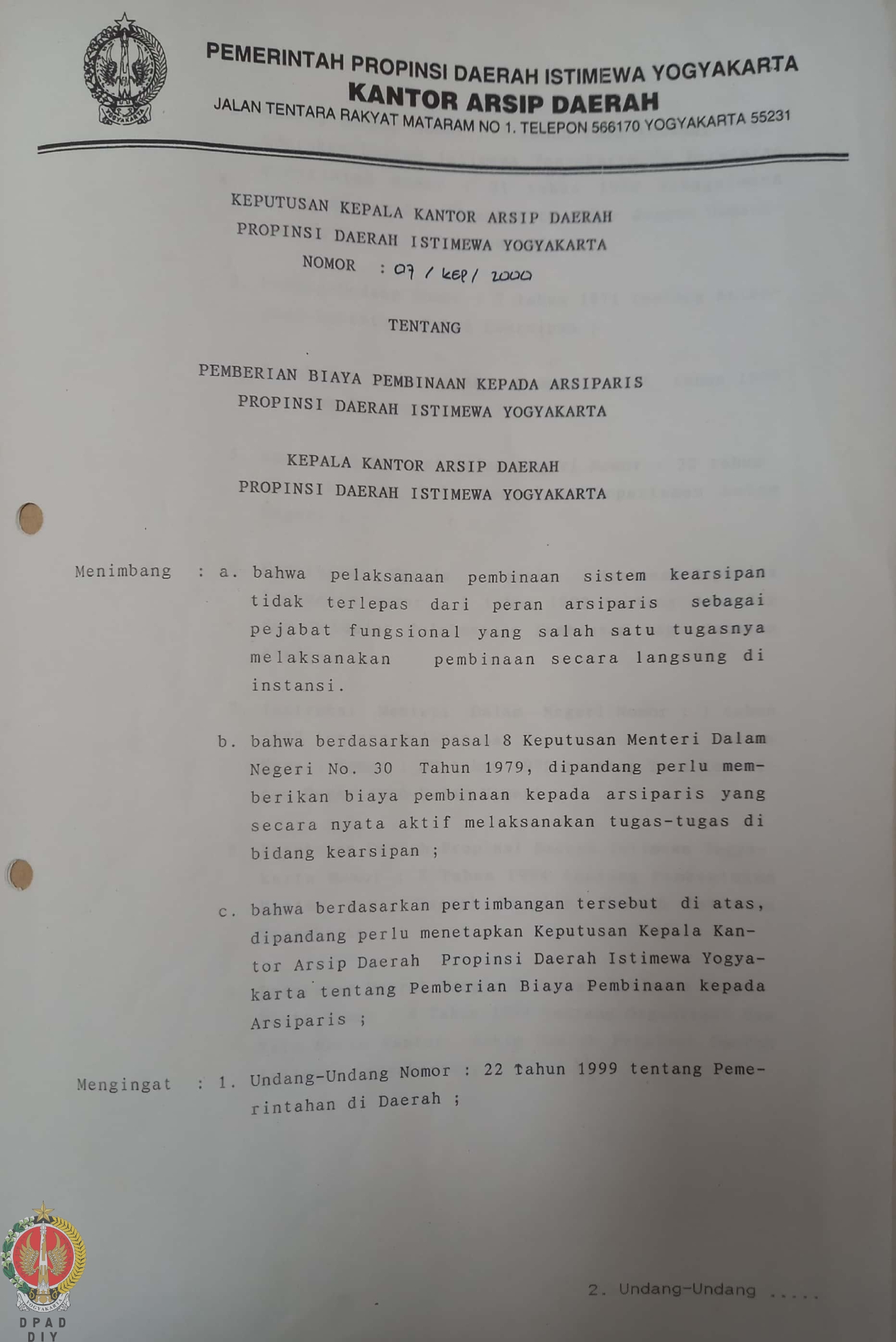 Keputusan Kepala Kantor Arsip Daerah Provinsi Daerah Istimewa Yogyakarta No: 07/KEP/2000 tentang Pemberian Biaya Pembinaan Kepada Arsiparis Provinsi Daerah Istimewa Yogyakarta.