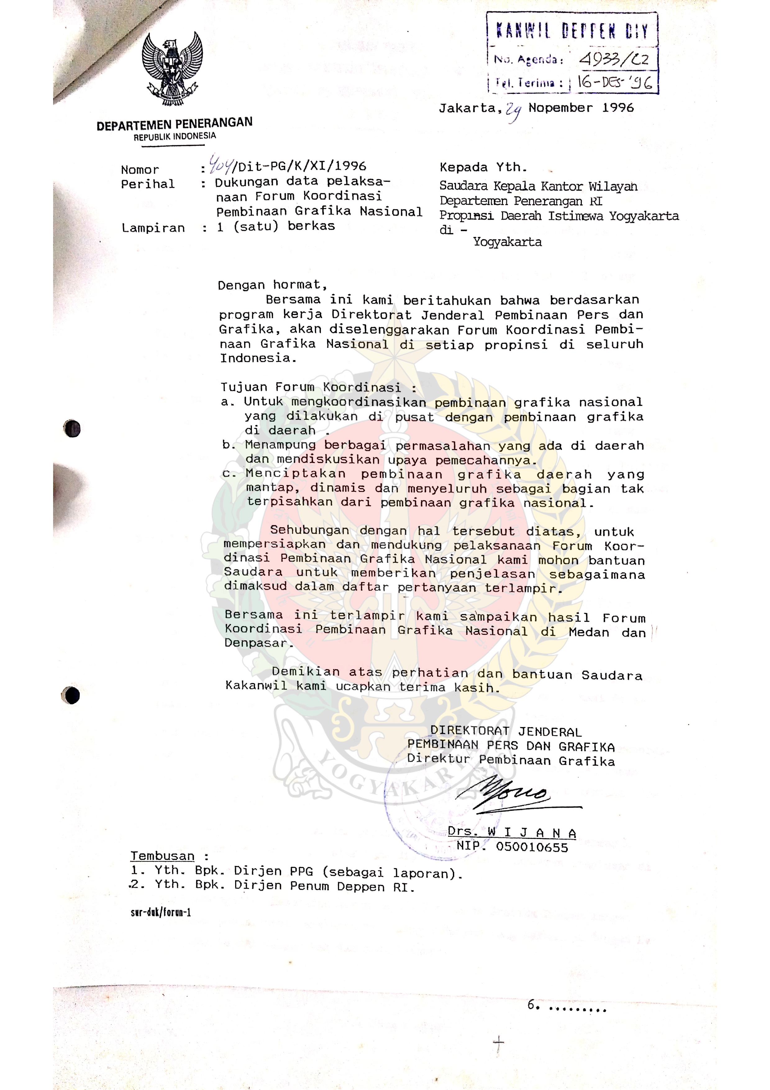 Surat dari Direktur Pembinaan Grafika Direktorat Jenderal Pembinaan Pers dan Grafika kepada Kepala Kantor Wilayah Departemen Penerangan Republik Indonesia di Yogyakarta perihal Dukungan Data Pelaksanaan Forum Koordinasi Pembinaan Grafika Nasional.