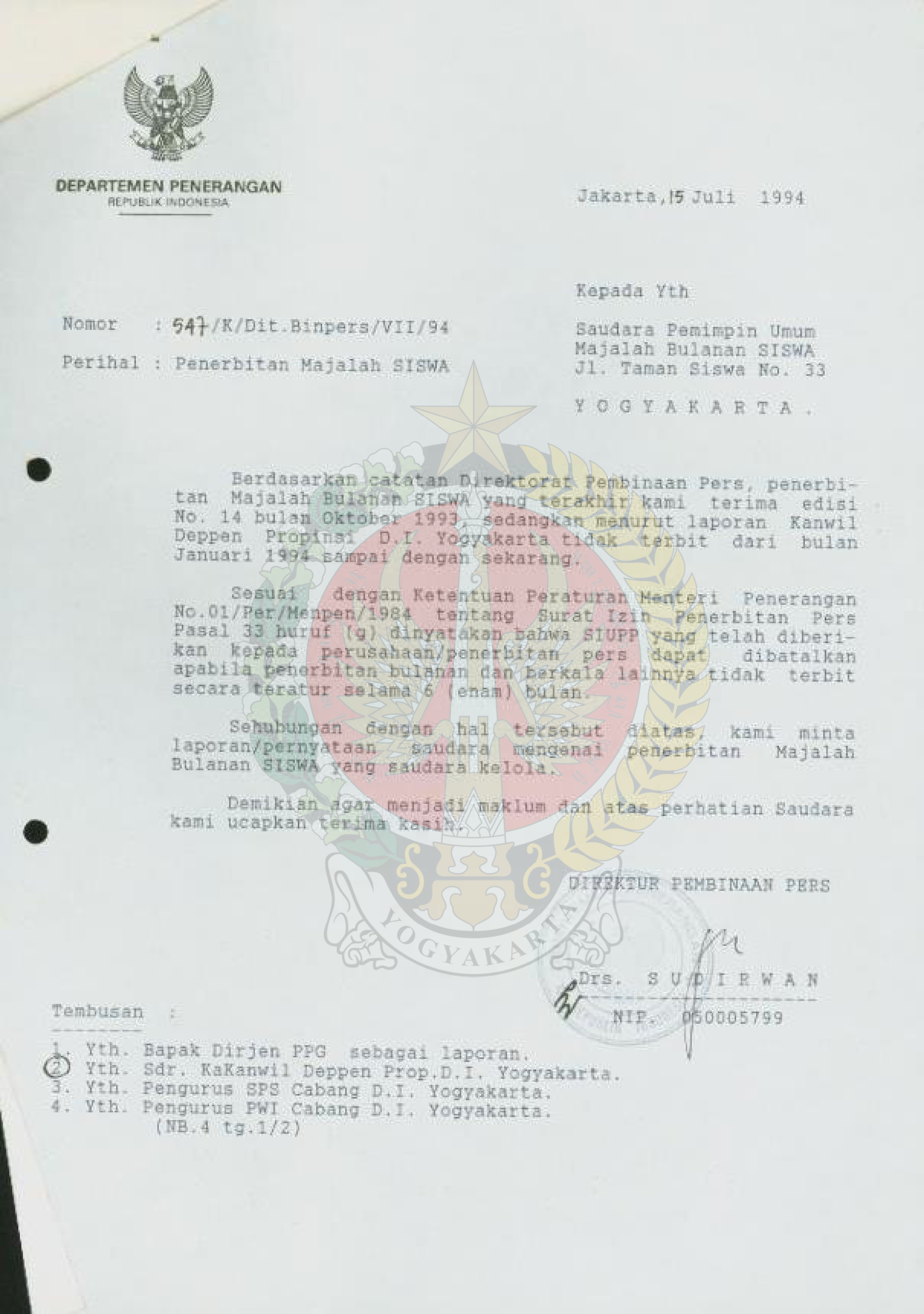 Surat dari Direktur Pembinaan Pers kepada Kepala Umum Majalah SISWA Yogyakarta perihal permintaan laporan/pernyataan mengenai penerbitan Majalah SISWA.