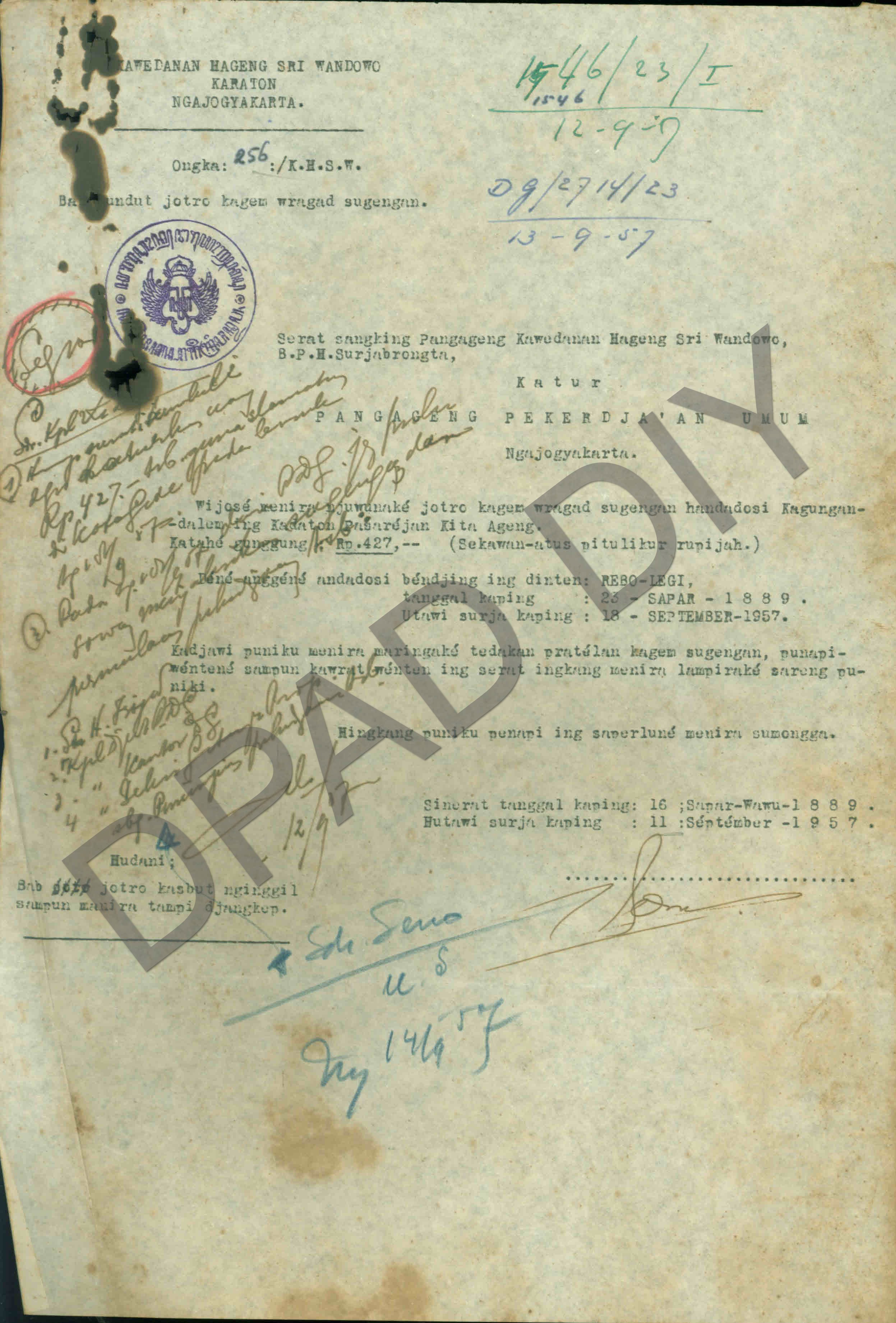 Surat dari Kawedanan Hageng Sri Wandawa Kraton Yogyakarta kepada Pengageng Pekerjaan Umum