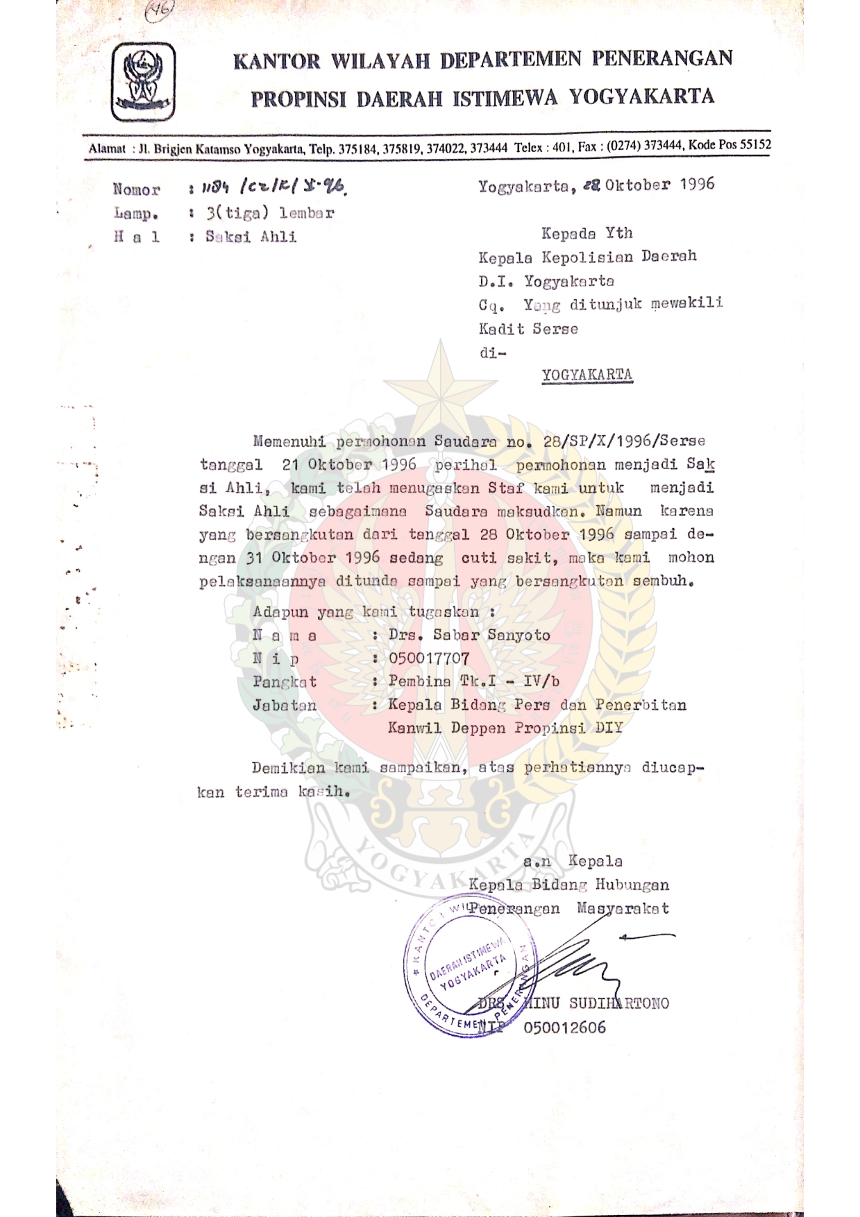 Surat dari Kepala Bidang Hubungan Penerangan Masyarakat yang bertindak atas nama Kepala Kepala Kantor Wilayah Departemen Penerangan Provinsi Daerah Istimewa Yogyakarta kepada Kepala Kepolisian Daerah Istimewa Yogyakarta perihal penugasan staf a.n Drs. Sabar Sanyoto selaku Kepala Bidang Pers dan Penerbitan Kantor Wilayah Departemen Penerangan Provinsi Yogyakarta sebagai saksi ahli.