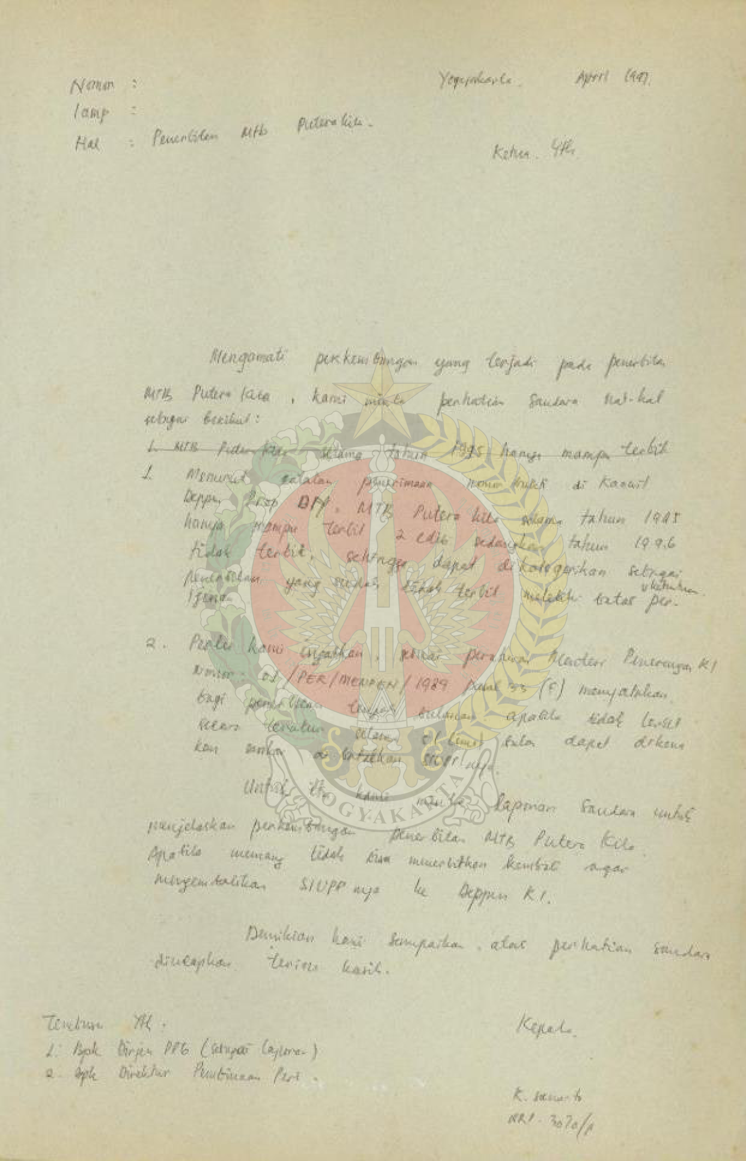 Surat dari Kepala Departemen Penerangan Republik Indonesia kepada Penerbit Majalah Tengah Bulanan Putera Kita mengenai teguran dan permintaan laporan perkembagan penerbitan MTB Putera Kita