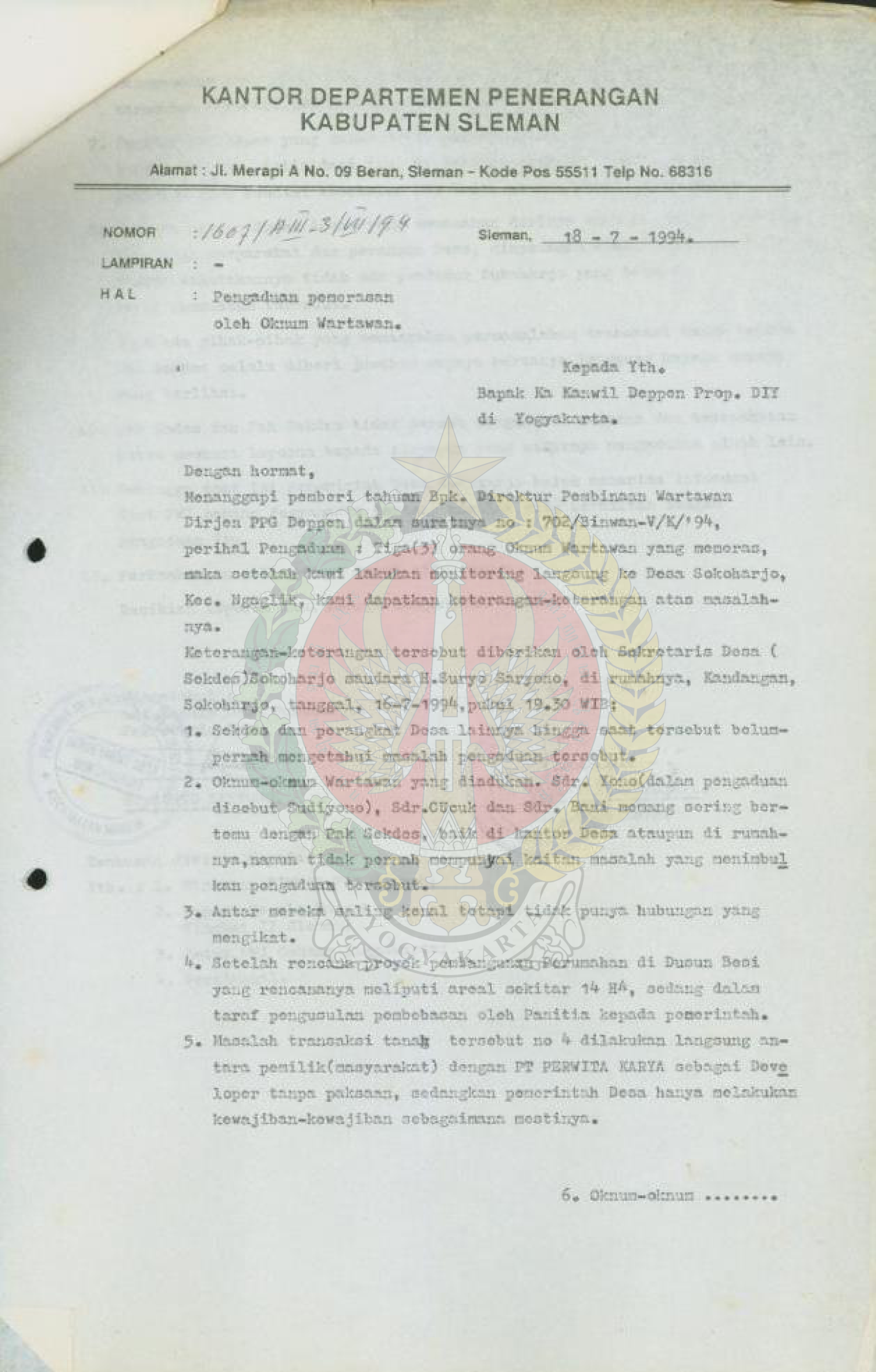 Surat dari Kepala Kantor Departemen Penerangan Kabupaten Sleman kepada Kepala Kantor Wilayah Departemen Penerangan Provinsi Daerah Istimewa Yogyakarta perihal pengaduan pemerasan oleh oknum wartawan.