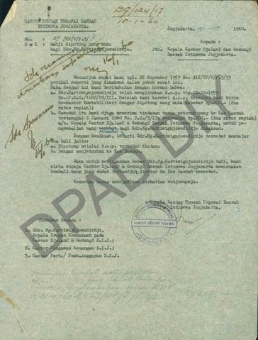 Surat dari Kepala Kantor Urusan Pegawai DIY kepada Kepala Kantor Jalan dan Gedung perihal pemotongan gaji untuk muka bagi Ng . Karti Wignya Sudirjo