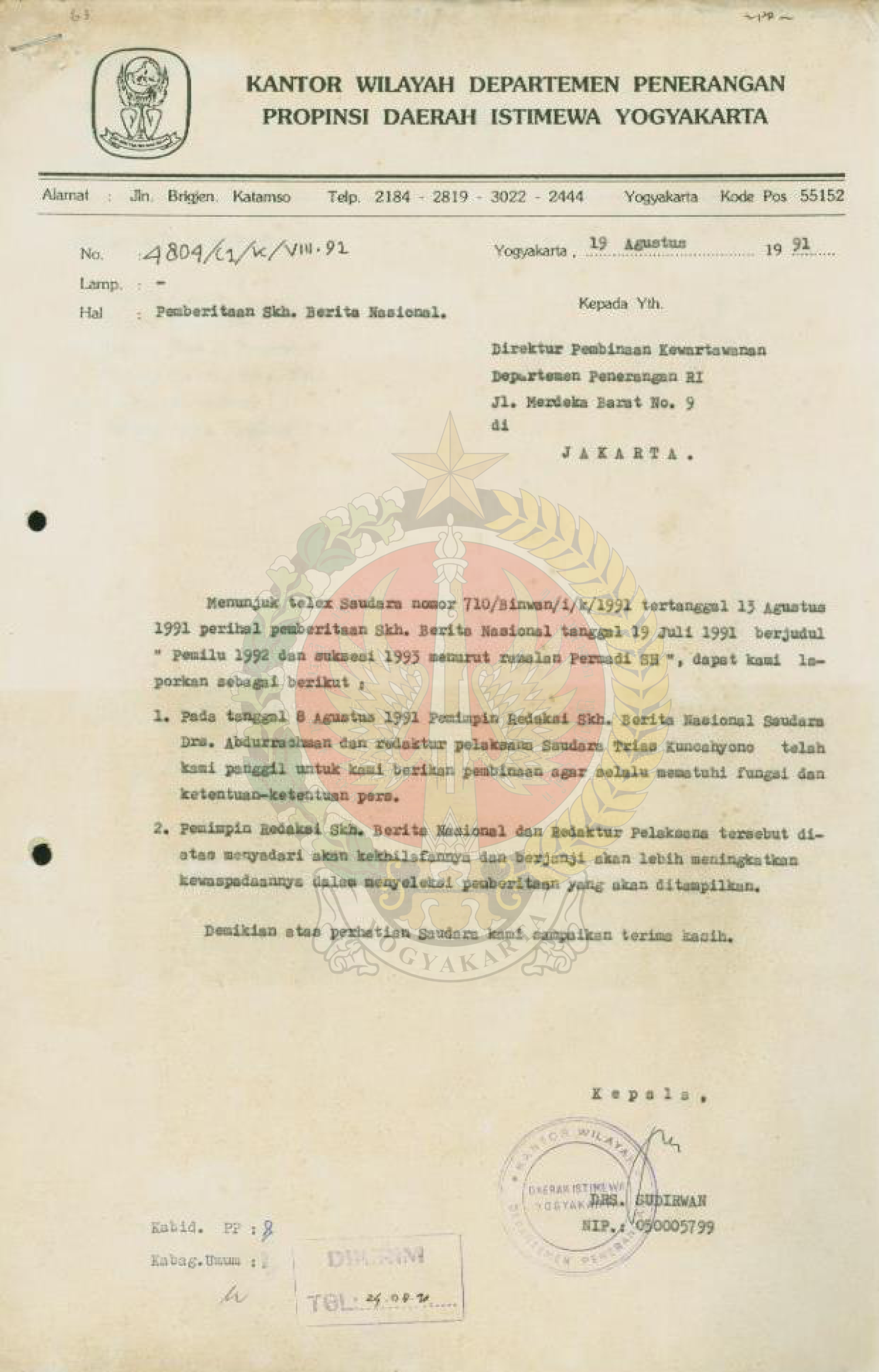 Surat dari Kepala Kantor Wilayah Departemen Penerangan Daerah Istimewa Yogyakarta kepada Direktur Pembinaan Kewartawanan Departemen Penerangan Republik Indonesia di Jakarta perihal Laporan terkait pemberitaan Surat kabar harian Bernas tanggal 19 Juli 1991 yang berjudul “Pemilu 1992 dan Suksesi 1993 menurut ramalan Permadi SH”.