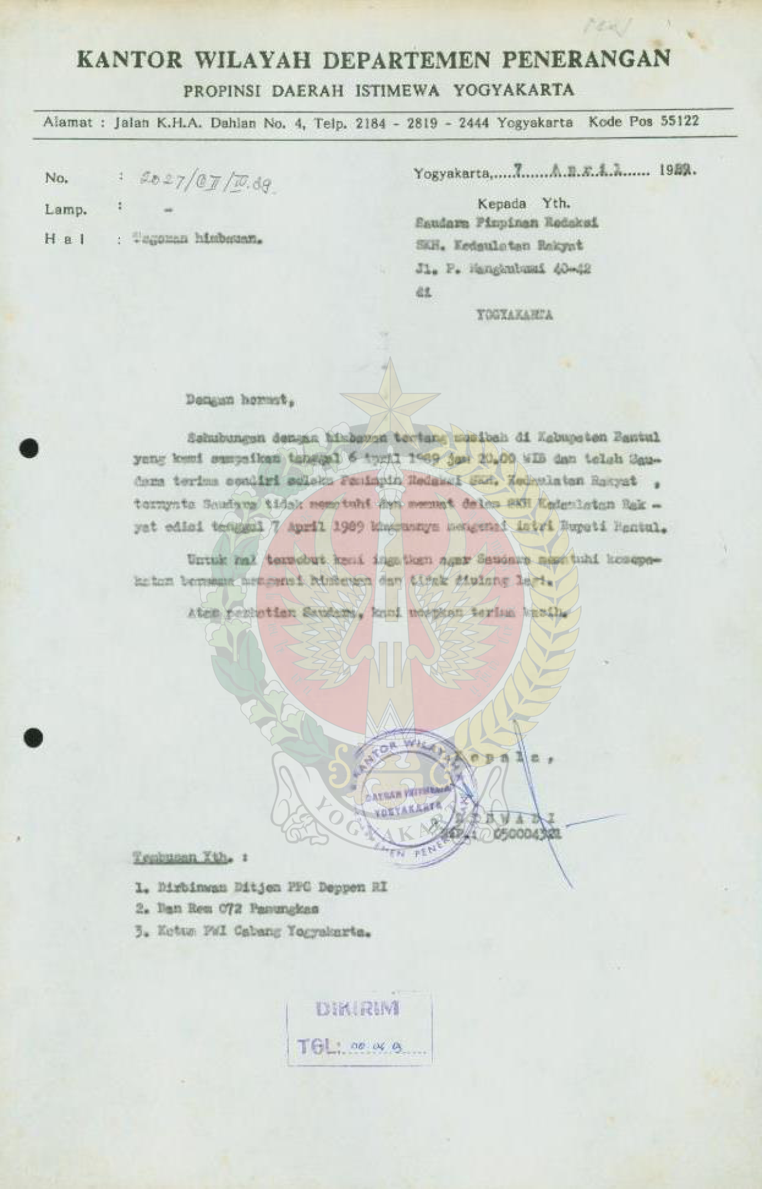 Surat dari Kepala Kantor Wilayah Departemen Penerangan Daerah Istimewa Yogyakarta kepada Pimpinan Redaksi Surat Kabar Harian Kedaulatan Rakyat perihal teguran himbauan kepada Surat Kabar Harian Kedaulatan Rakyat terkait pemberitaan Istri Bupati Bantul.