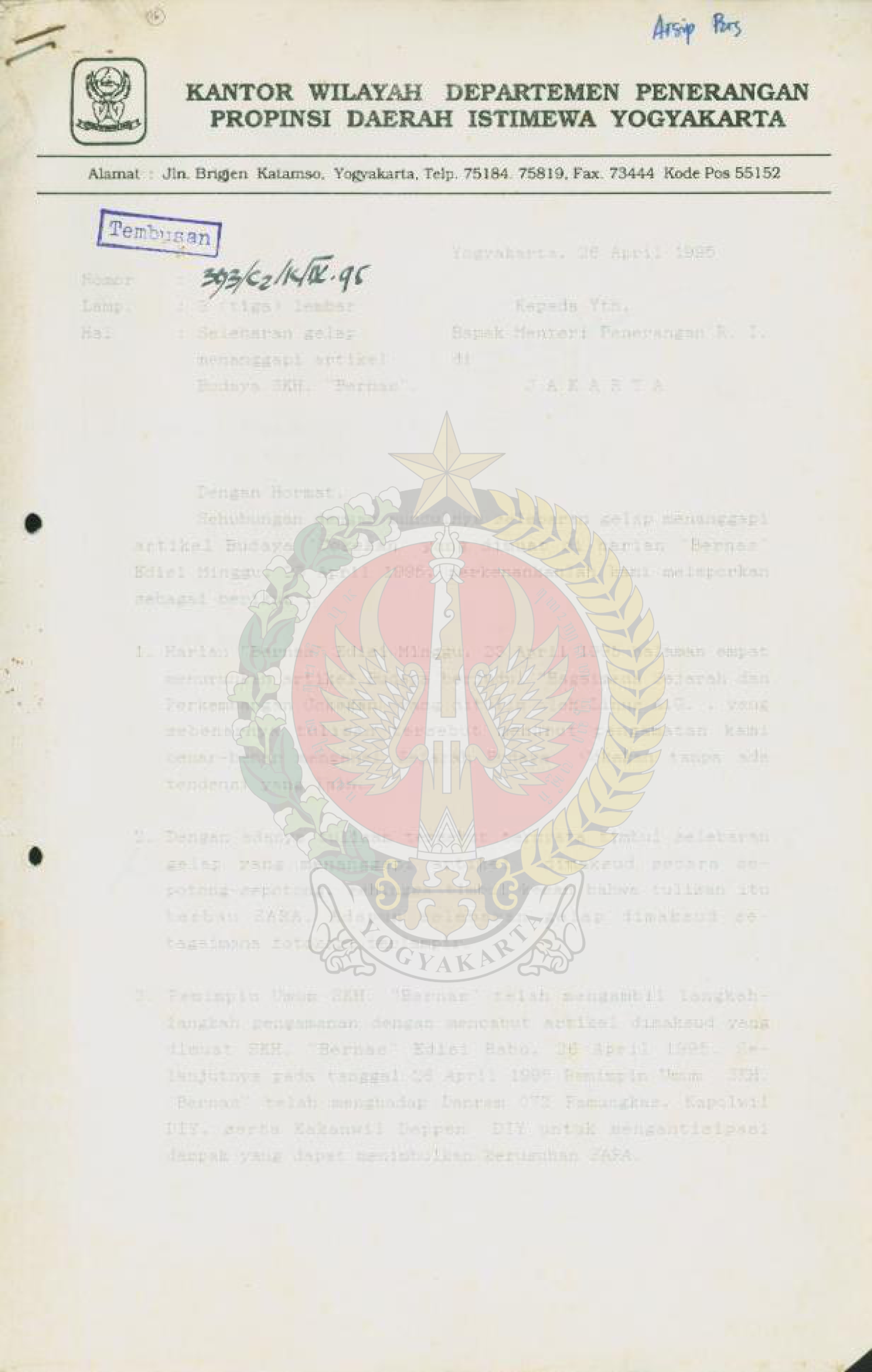Surat dari Kepala Kantor Wilayah Departemen Penerangan Provinsi Daerah Istimewa Yogyakarta kepada Menteri Penerangan Republik Indonesia perihal Laporan tentang selebaran gelap yang menanggapi artikel Budaya Surat kabar harian Bernas.