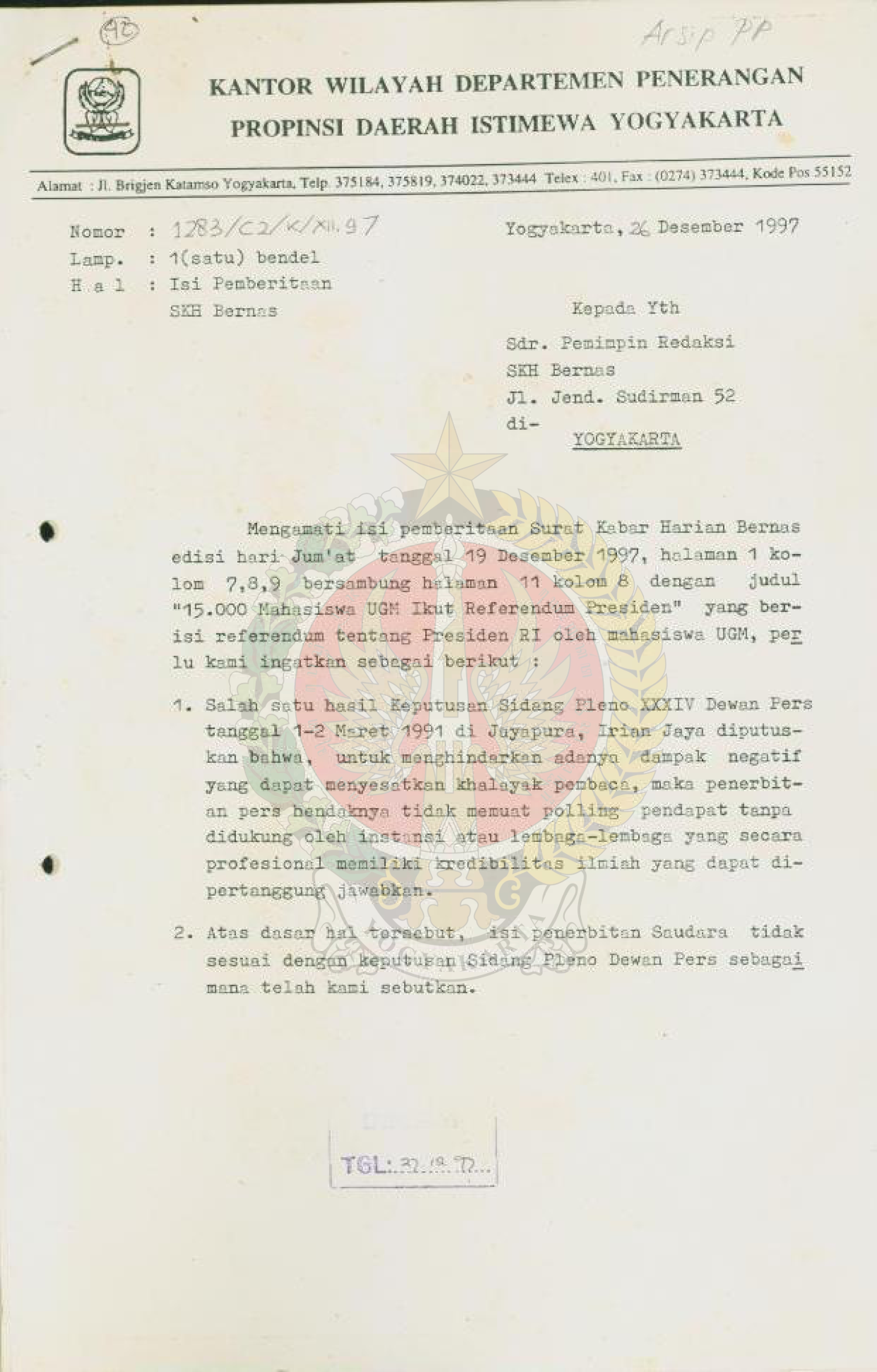 Surat dari Kepala Kantor Wilayah Departemen Penerangan Provinsi Daerah Istimewa Yogyakarta kepada Redaksi Surat Kabar Harian Bernas Yogyakarta perihal peringatan tentang isi berita Surat Kabar Harian Bernas tanggal 19 Desember 1997 yang berjudul โ€œ15.000 Mahasiswa UGM ikut Referendum Presidenโ€ beserta lampirannya.