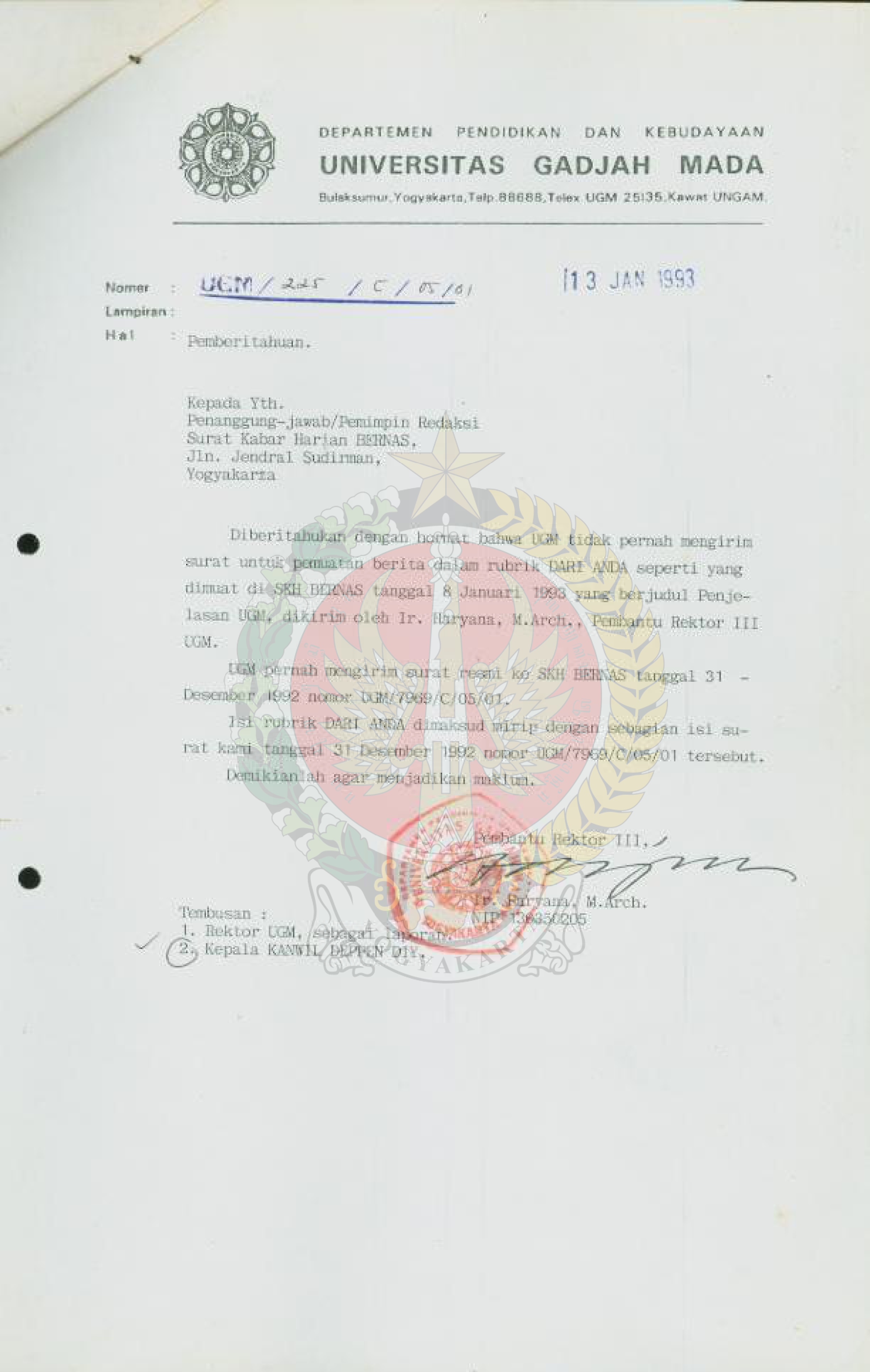 Surat dari Pembantu Rektor III Universitas Gadjah Mada kepada Penanggung jawab/ Pimpinan Redaksi Surat Kabar Harian Bernas perihal pemberitahuan bahwa UGM tidak perah mengirim surat untuk pemuatan berita seperti yang di muat dalam Surat Kabar Harian Bernas 8 Januari 1993 yang berjudul Pejelasan UGM dikirim oleh Ir. Haryana, M. Arch.