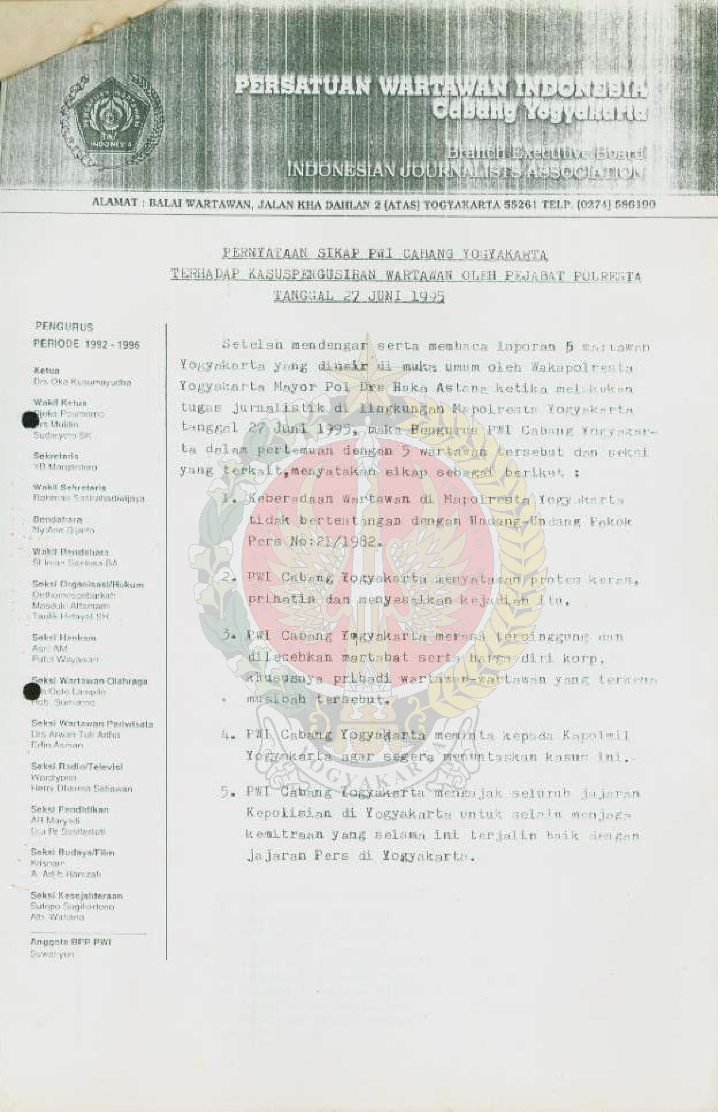 Surat dari Pengurus Persatuan Wartawan Indonesia Cabang Yogyakarta kepada Kantor wilayah Departemen Penerangan Bidang Pes dan Penerbitan Provinsi Daerah Istimewa Yogyakarta perihal pernyataan sikap PWI terhadap kasus pengusiran wartawan oleh Pejabat Polresta.