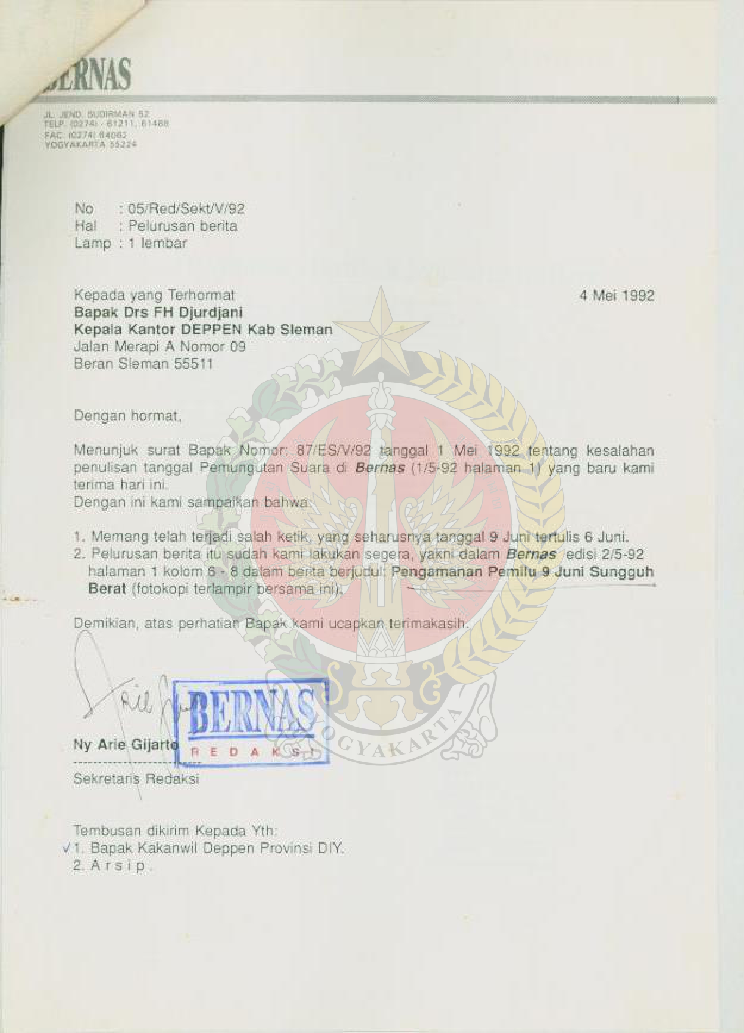 Surat dari Sekretaris Redaksi Bernas kepada Kepala Kantor Departemen Penerangan Kabupaten Sleman perihal hasil penelusuran kesalahan penulisan tanggal pemungutan suara dalam Judul “ Pengamanan Pemilu 9 Juni Sungguh Berat”, beserta lampirannya.