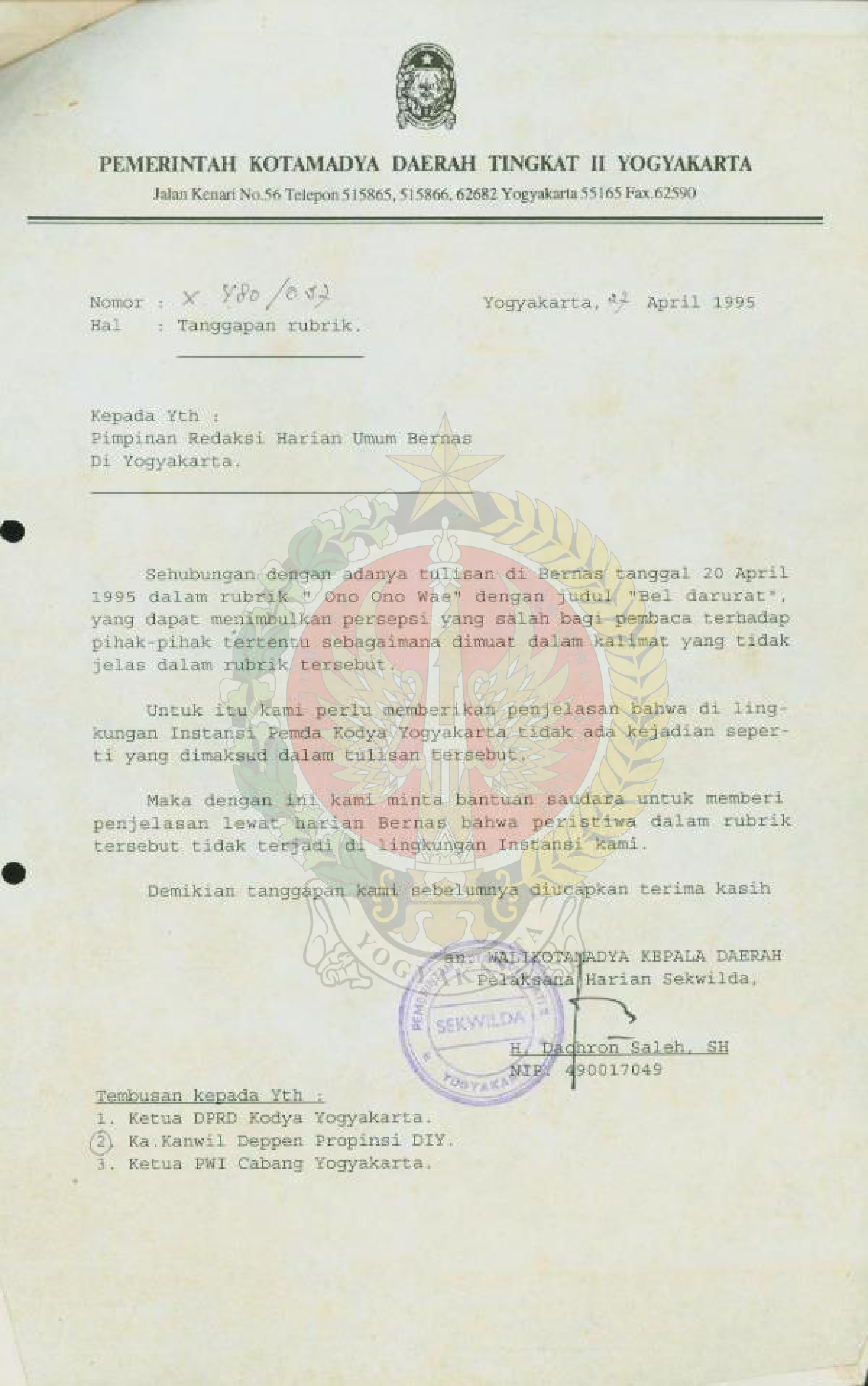 Surat dari Walikotamadya kepala Daerah Pelaksana Harian Sekwilda kepada Pimpinan Redaksi Harian Umum Bernas di Yogyakarta perihal tanggapan rubrik “Ono-ono wae” di Bernas 20 April 1995 dengan judul “Bel Darurat” bahwa di lingkungan Instansi Pemerintah Daerah Kodya Yogyakarta tidak ada kejadia seperti yang dimaksud dalam tulisan tersebut.
