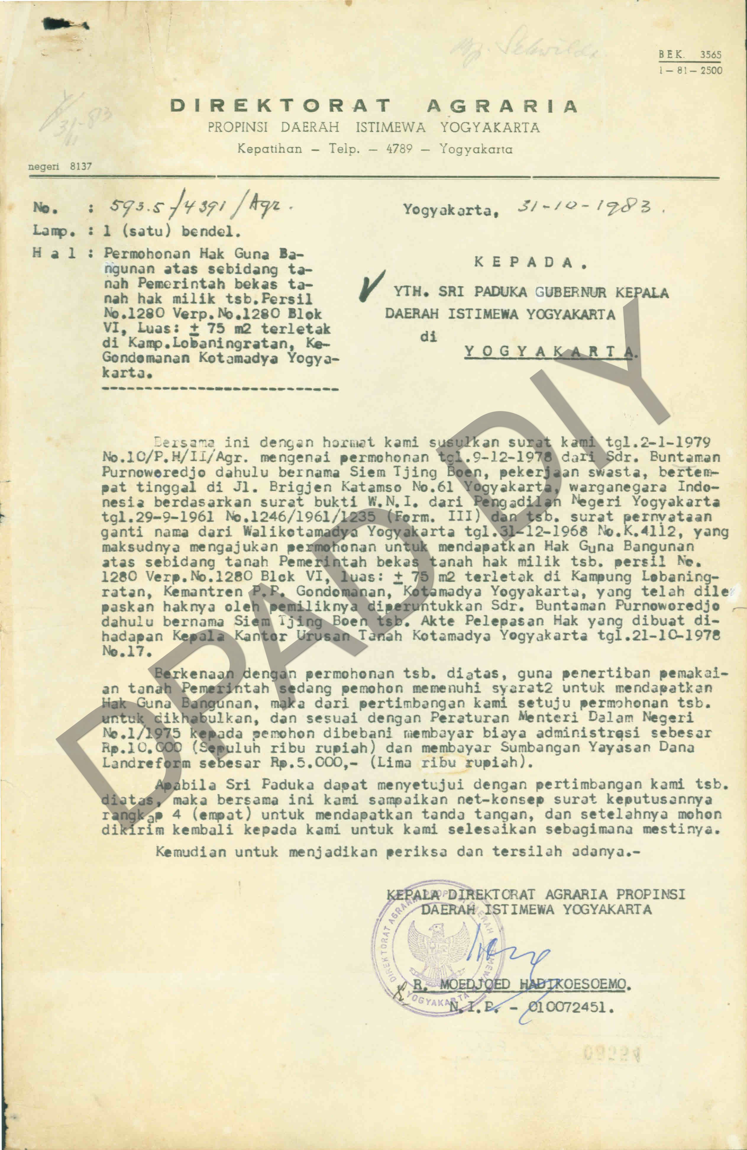 Surat Direktorat Agraria Propinsi DIY kepada Wakil Gubernur DIY tentang permohonan Buntaman Purnowo Redjo Hak Guna Bangunan atas sebidang tanah pemerintah bekas tanah Hak Milik persil No: 1280 Verp. No: 1280 blok VI di Kampung Lobaningratan Gondomanan
