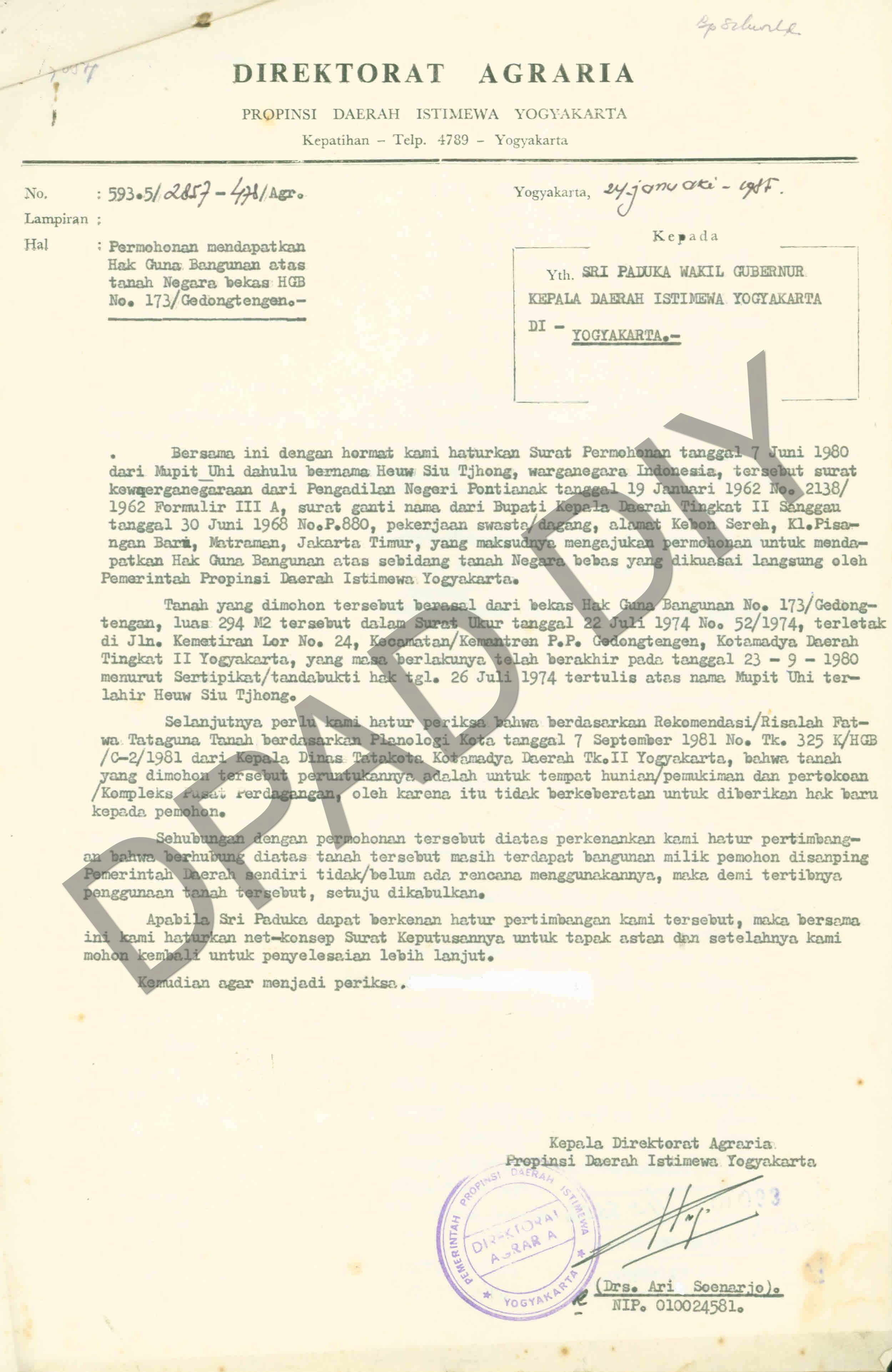 Surat Direktorat Agraria Propinsi DIY kepada Wakil Gubernur DIY tentang permohonan dari Mupit Uhi dahulu bernama Heuw Siu Tjhong untuk mendapatkan Hak Guna Bangunan atas tanah yang berasal dari bekas HGB HGB No: 173/Gedongtengen dengan luas 294 m2 terletak di Jl. Kemetiran Lor No. 24, Kecamatan/Kemantren P.P Gedongtengen Kotamadya Yogyakarta yang masa berlakunya telah berakhir pada tanggal 23-9-1980