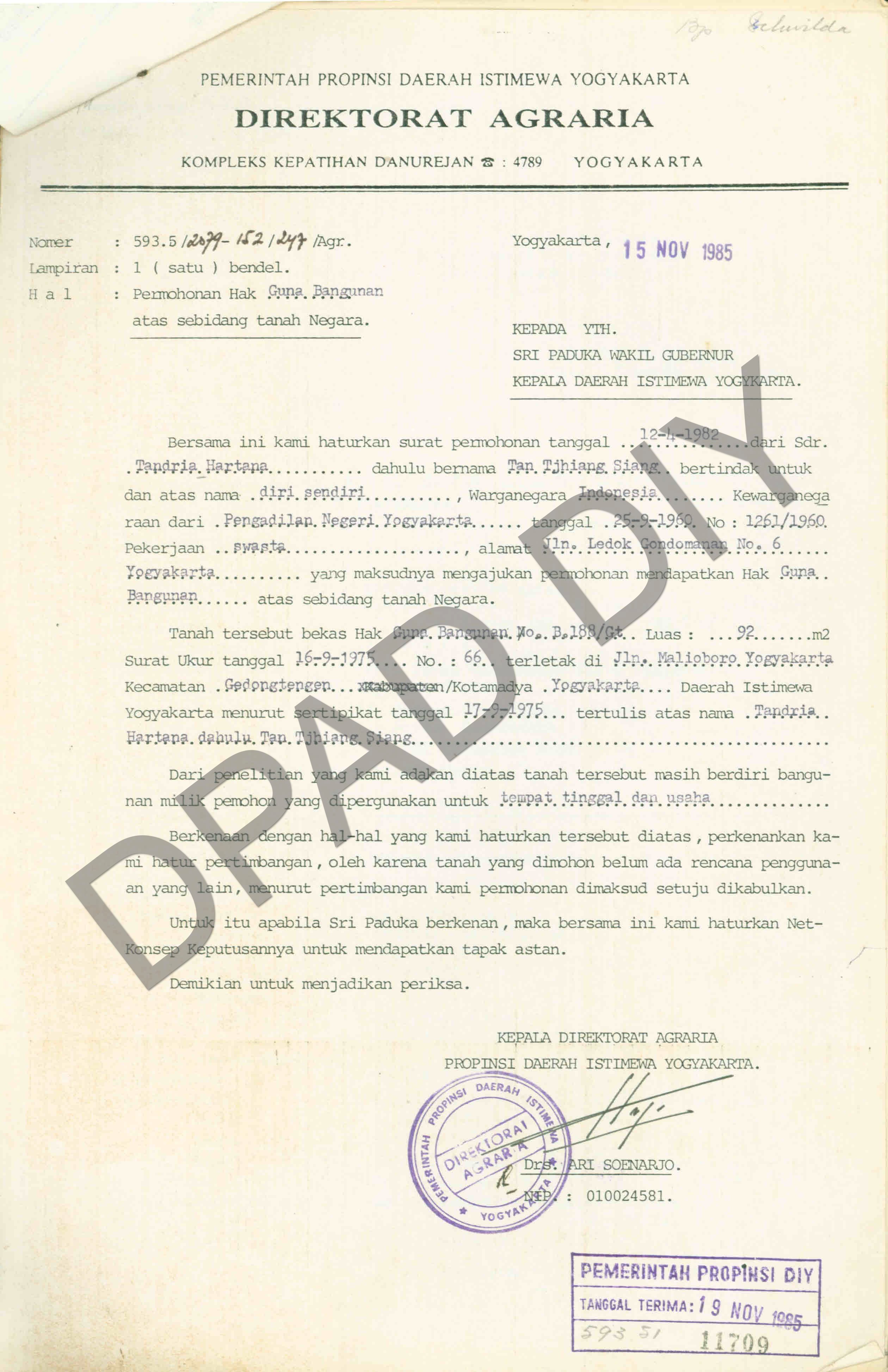 Surat Direktorat Agraria Propinsi DIY kepada Wakil Gubernur DIY tentang permohonan Hak Guna Bangunan atas sebidang tanah negara atas nama Tandrio Hartono terletak di Jalan Malioboro, Kecamatan Gedongtengen