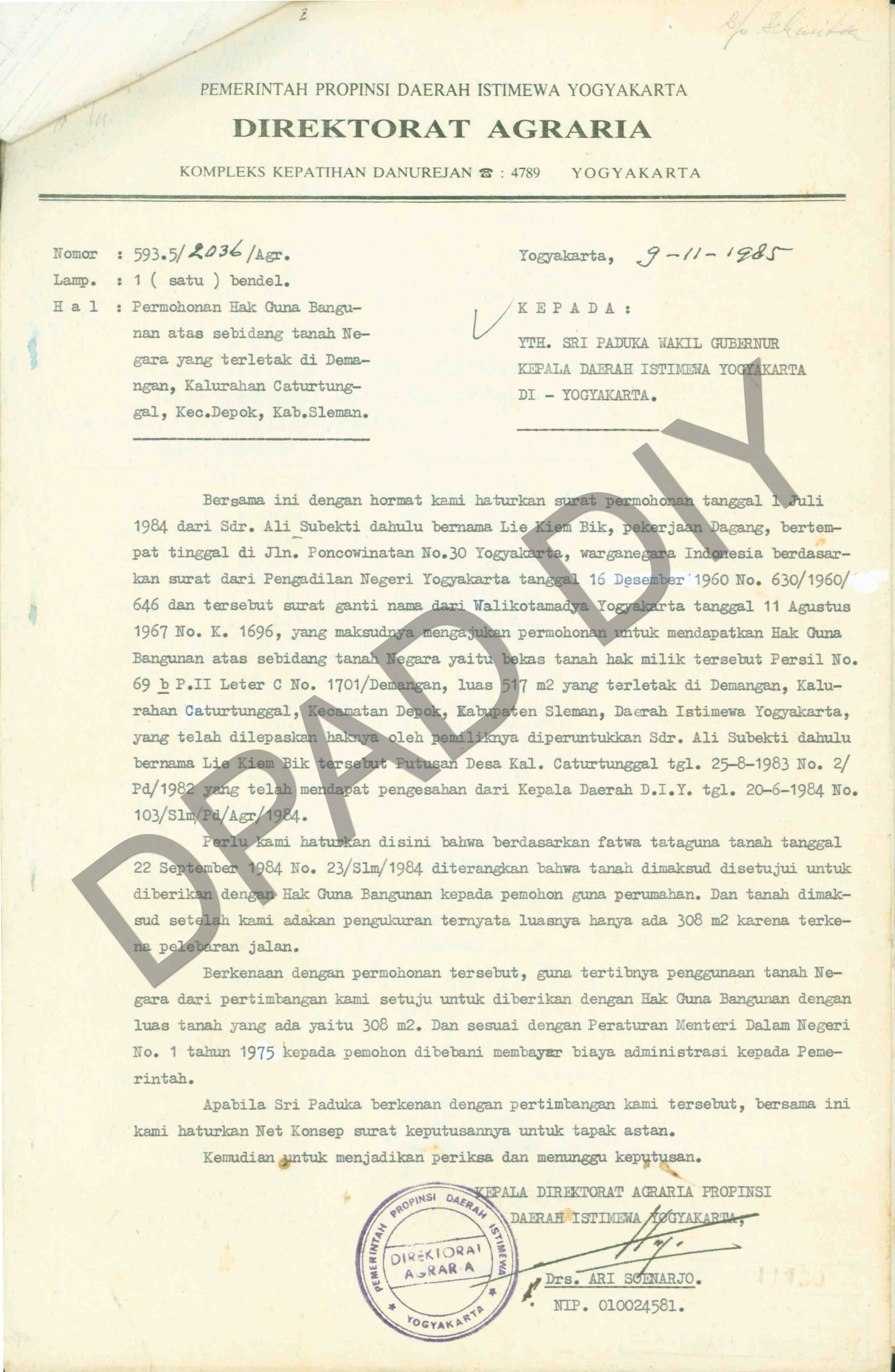 Surat Direktorat Agraria Propinsi DIY kepada Wakil Gubernur DIY tentang permohonan Hak Guna Bangunan atas sebidang tanah negara yang terletak di Demangan, Kalurahan Caturtunggal, Kecamatan Depok, Kabupaten Sleman atas nama Sdr. Ali Subekti dahulu Lie Kiem Bik