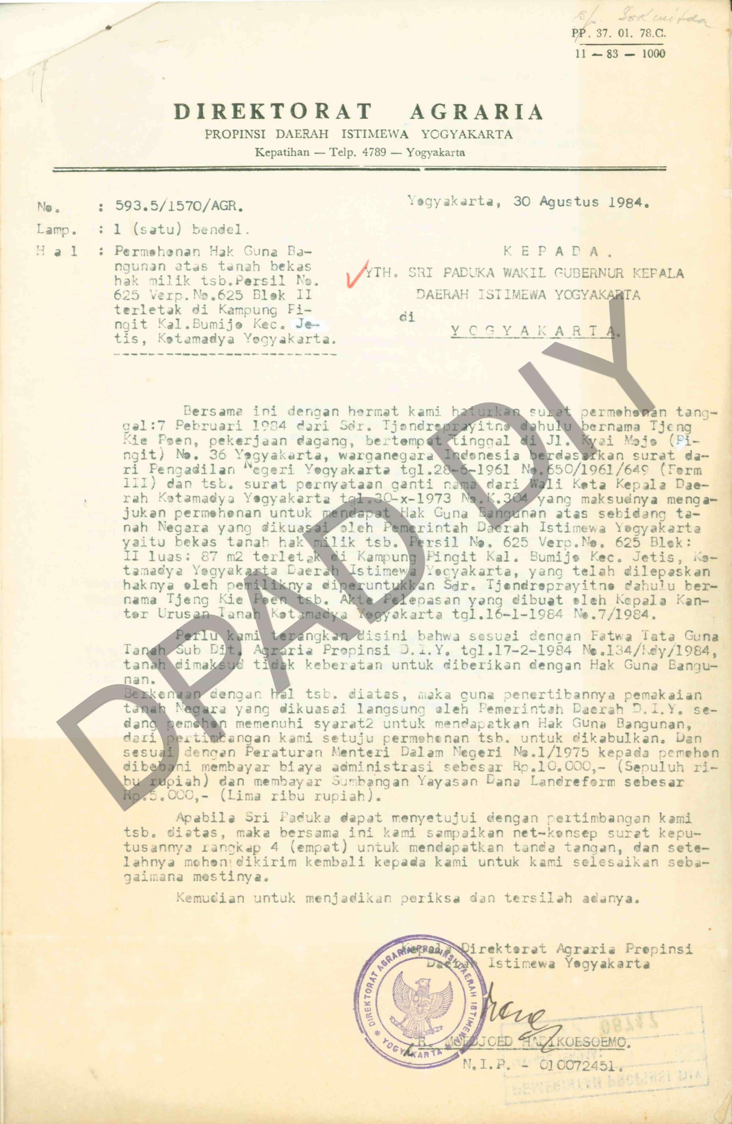 Surat Direktorat Agraria Propinsi DIY kepada Wakil Gubernur DIY tentang permohonan Hak Guna Bangunan atas tanah bekas Hak Milik persil. No. 625 Verp. No. 625 Blok II terletak di Kampung Pingit, Kalurahan Bumijo, Kecamatan Jetis, Kotamadya Yogyakarta atas nama Sdr. Tjondroprayitno dahulu bernama Tjeng Kie Poen terletak di Jalan Kyai Mojo (Pingit) No. 36 Yogyakarta
