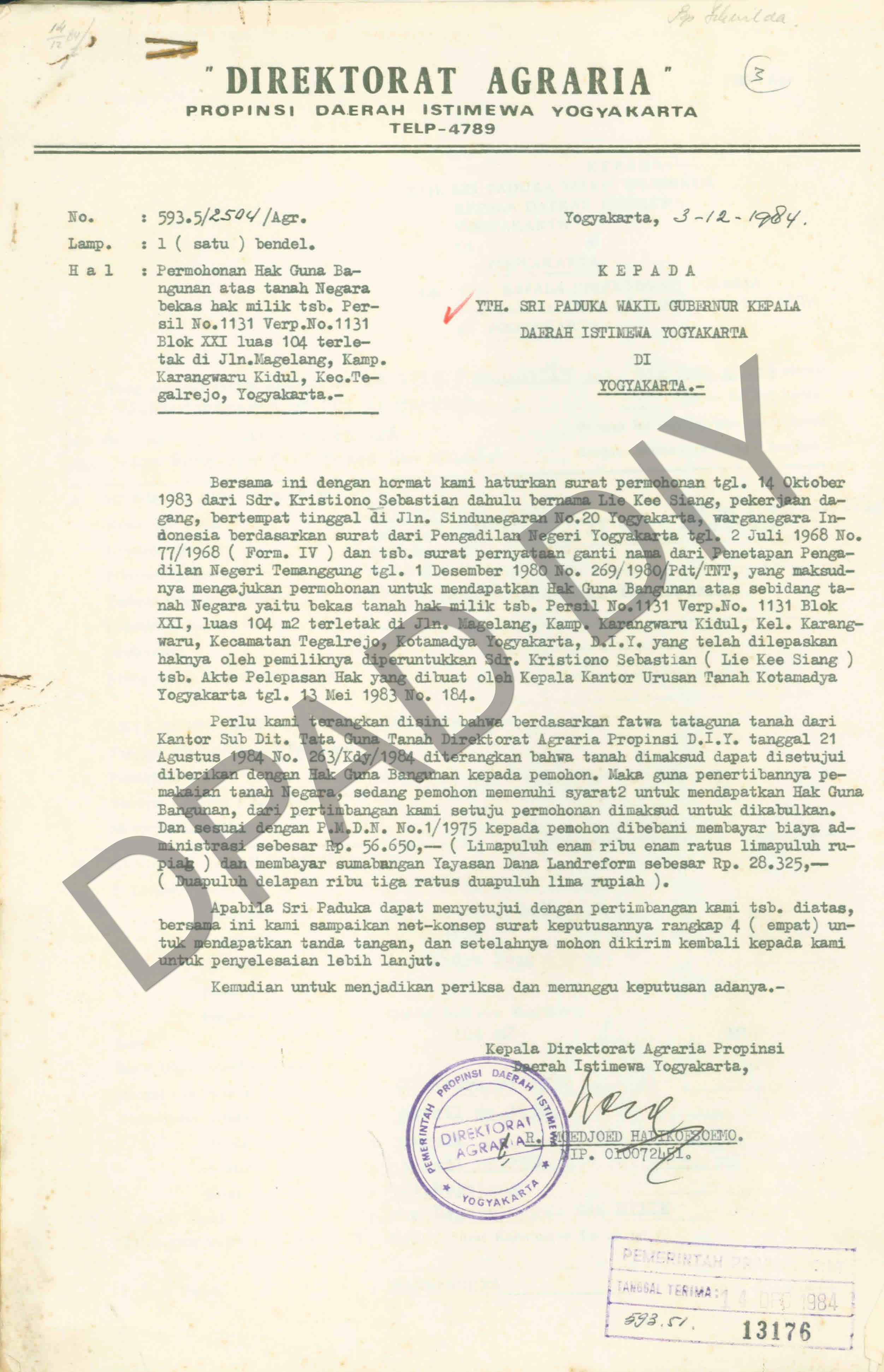 Surat Direktorat Agraria Propinsi DIY kepada Wakil Gubernur DIY tentang permohonan Hak Guna Bangunan atas tanah negara bekas Hak Milik persil. No. 1131 Verp. No. 1131 Blok XXI luas 104 terletak di Jalan Magelang Kampung Karangwaru Kidul, Kecamatan Tegalrejo, Yogyakarta dari Sdr. Kristiono Sebastian dahulu bernama Lie Kee Siang.