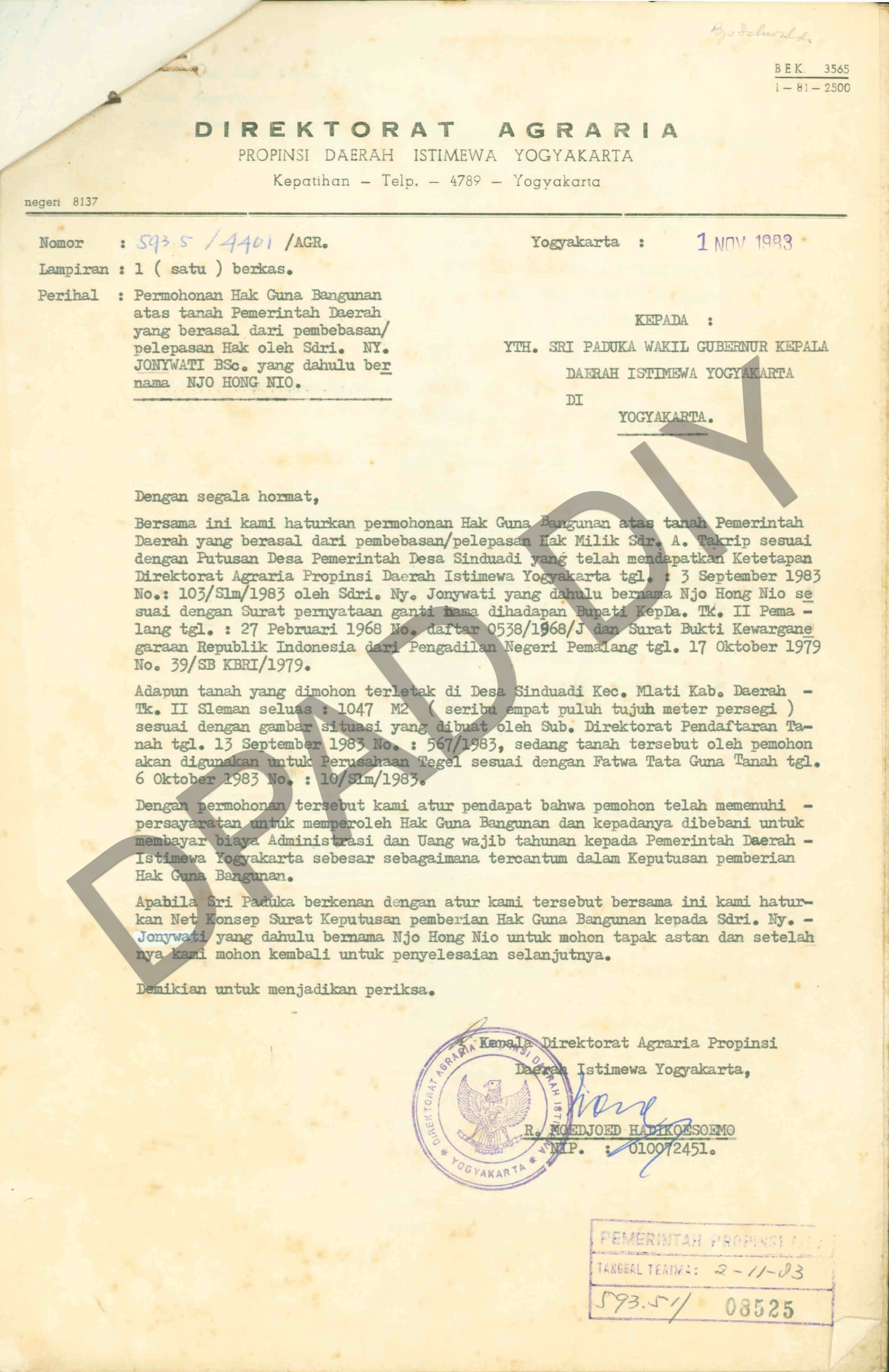 Surat Direktorat Agraria Propinsi DIY kepada Wakil Gubernur DIY tentang permohonan Hak Guna Bangunan atas tanah pemerintah daerah yang berasal dari pembebasan/pelepasan hak oleh Sdri. Ny. Jonywati Bsc. yang dahulu bernama Njo Hong Nio yang terletak di Desa Sinduadi Kecamatan Mlati, Kabupaten Daerah Tingkat II Sleman.