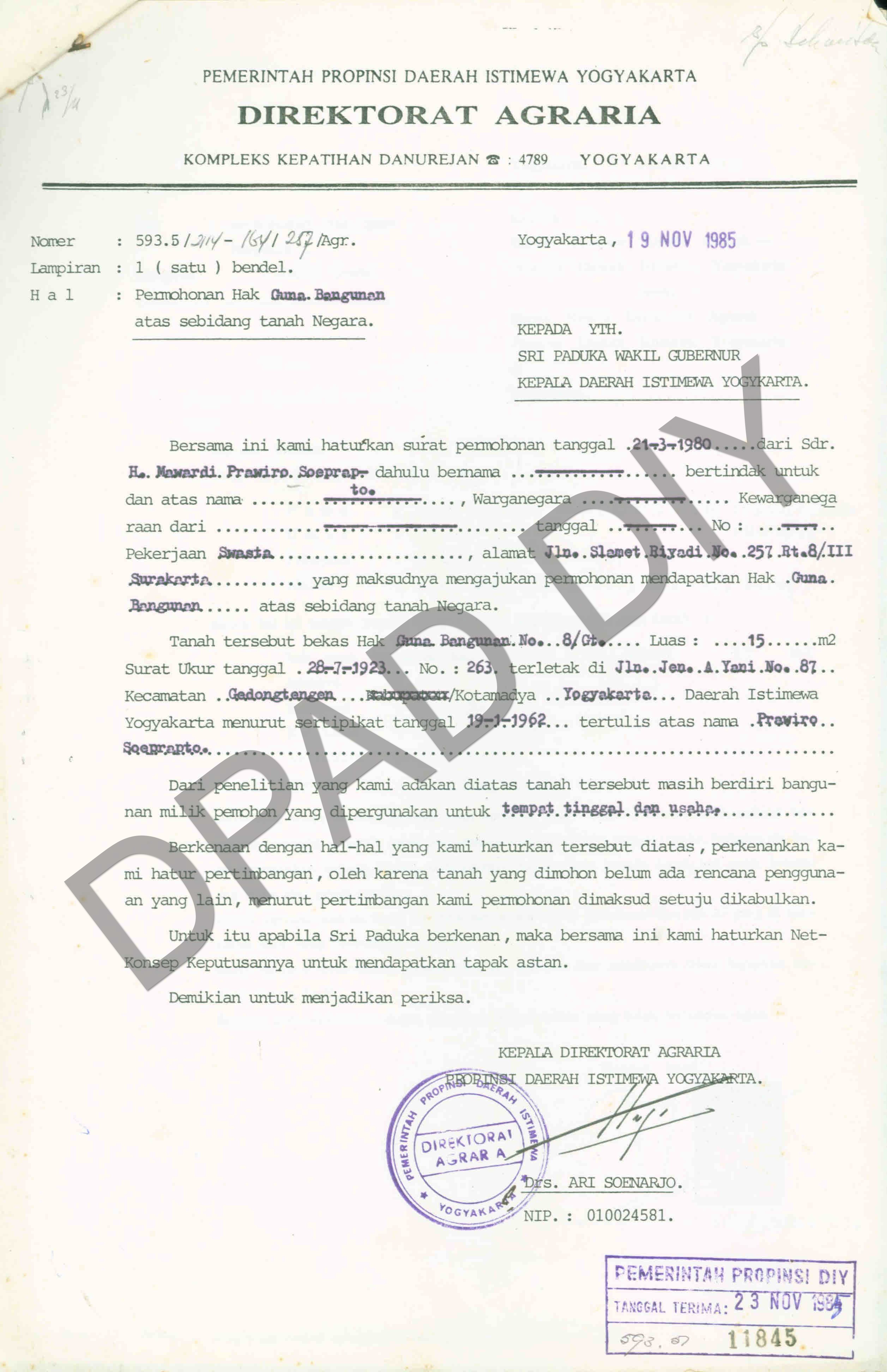 Surat Direktorat Agraria Propinsi DIY kepada Wakil Gubernur DIY tentang permohonan Hak Guna Bangunan sebidang tanah negara atas nama H. Mawardi Prawiro Soeprapto yang terletak di Jalan Jendral A. Yani No: 87, Kecamatan Gedongtengen