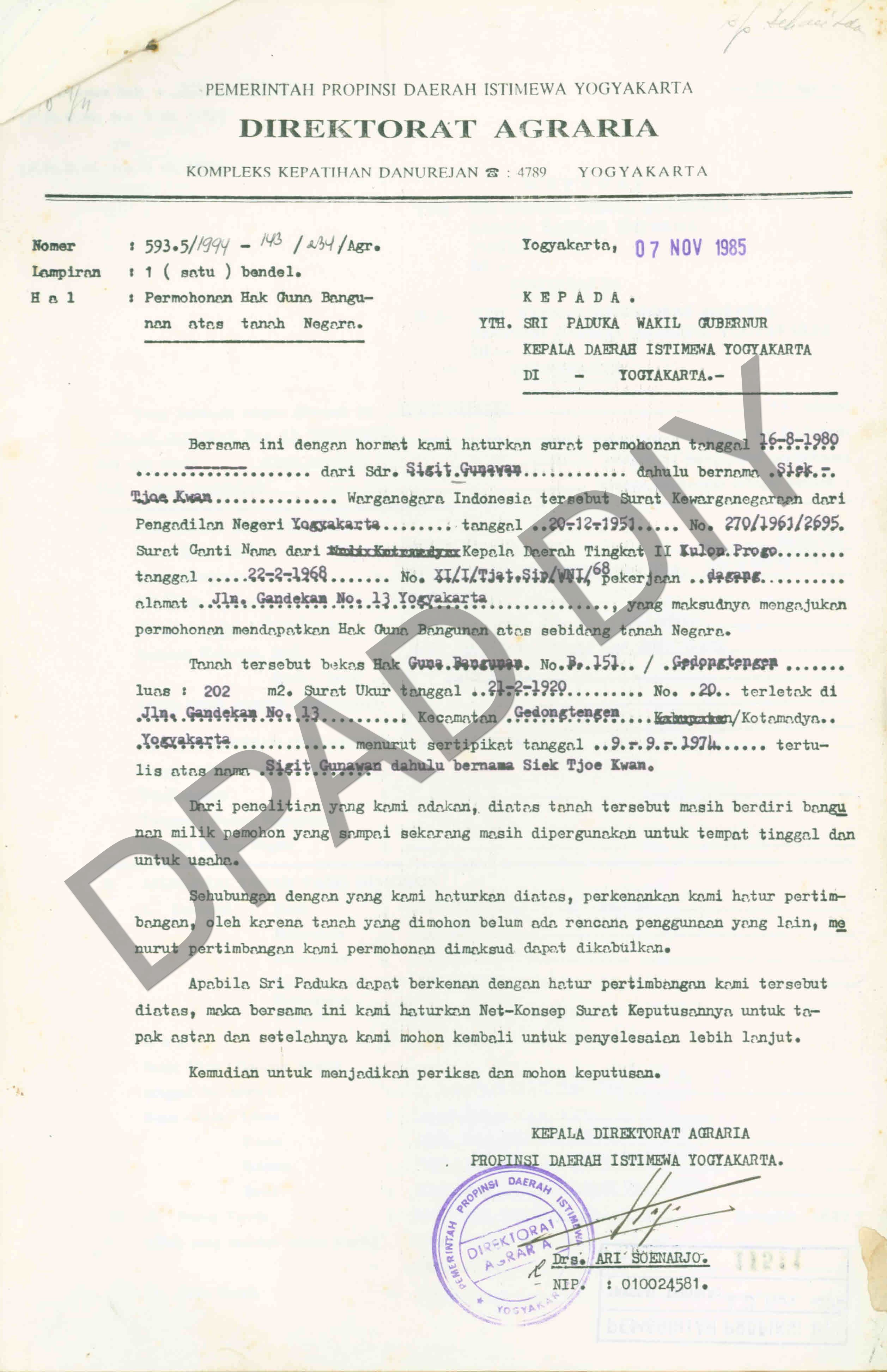 Surat Direktorat Agraria Propinsi DIY kepada Wakil Gubernur DIY tentang permohonan Hak Guna Bangunan tanah negara atas nama Sigit Gunawan terletak di Jalan Gandekan No: 13, Kecamatan Gedongtengen.