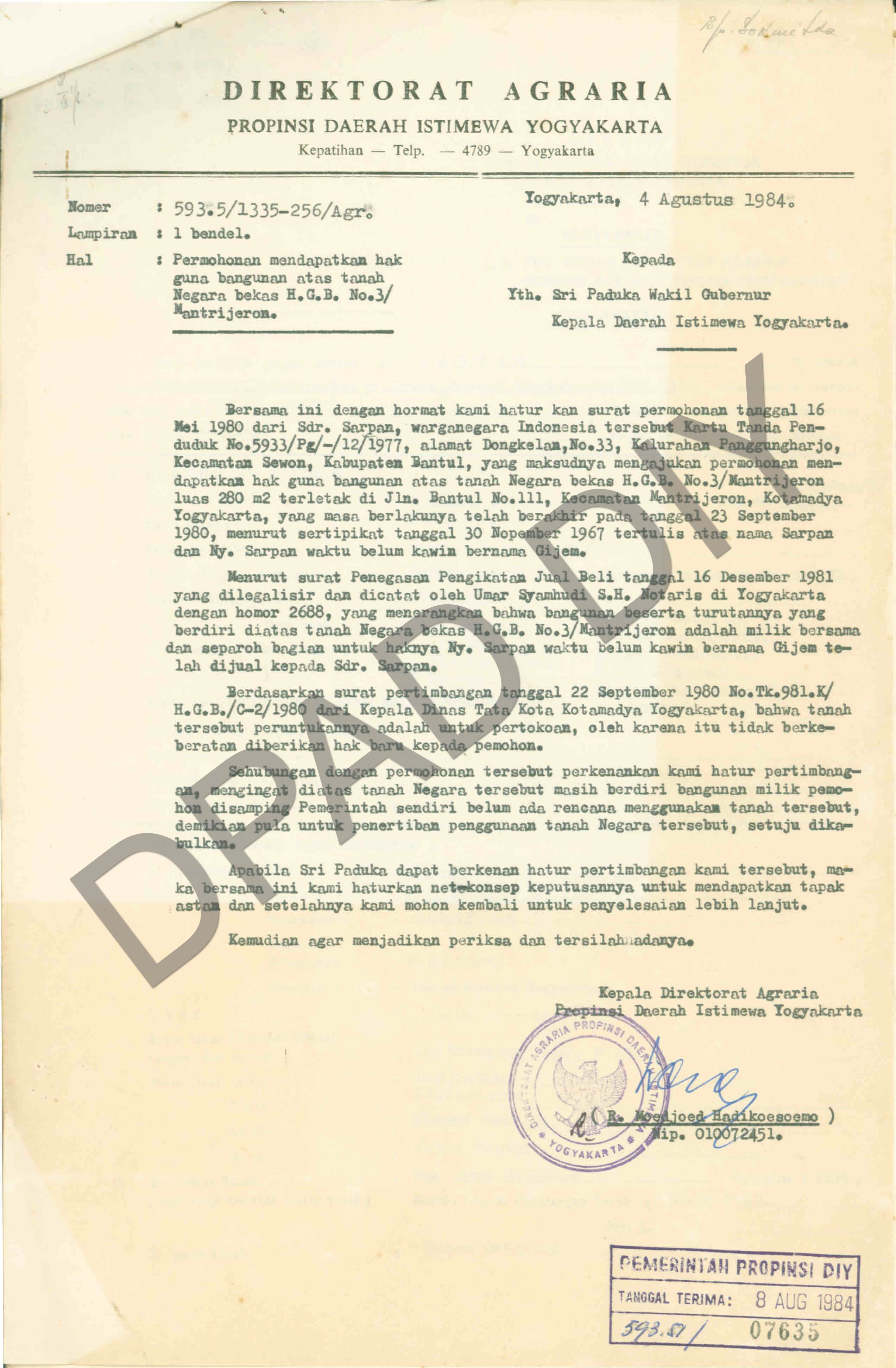 Surat Direktorat Agraria Propinsi DIY kepada Wakil Gubernur DIY tentang permohonan mendapatkan Hak Guna Bangunan atas tanah negara bekas HGB No. 3/ Mantrijeron dari Sdr. Sarpan, terletak di Jalan Bantul No. III, Kecamatan Mantrijeron, Kotamadya Yogyakarta.