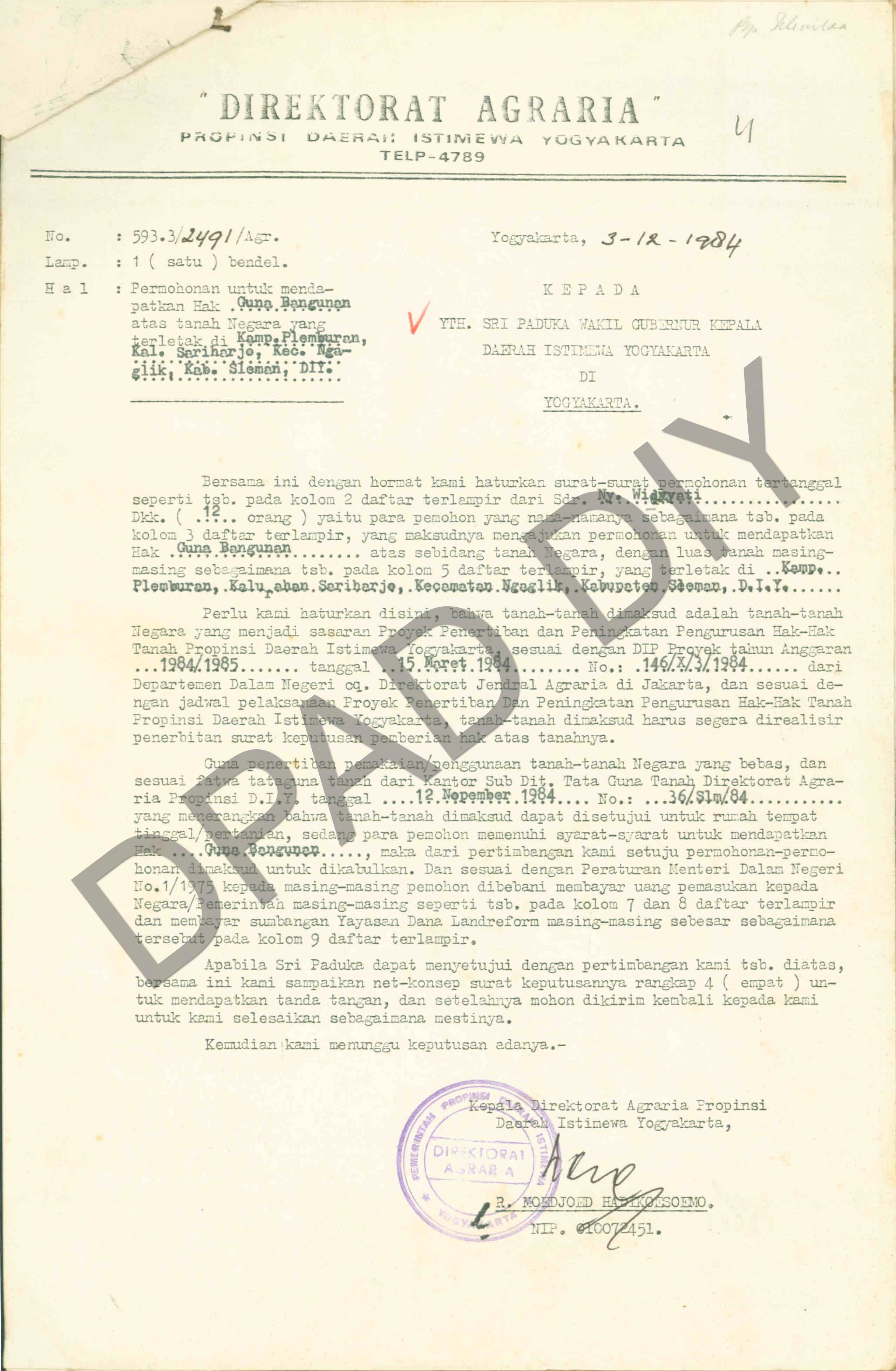 Surat Direktorat Agraria Propinsi DIY kepada Wakil Gubernur DIY tentang permohonan untuk mendapatkan Hak Guna Bangunan atas tanah negara yang terletak di Kampung Plemburan, Kalurahan Sariharjo, Kecamatan Ngaglik, Kabupaten Sleman, DIY atas nama Ny. Widawati dkk (12 orang).