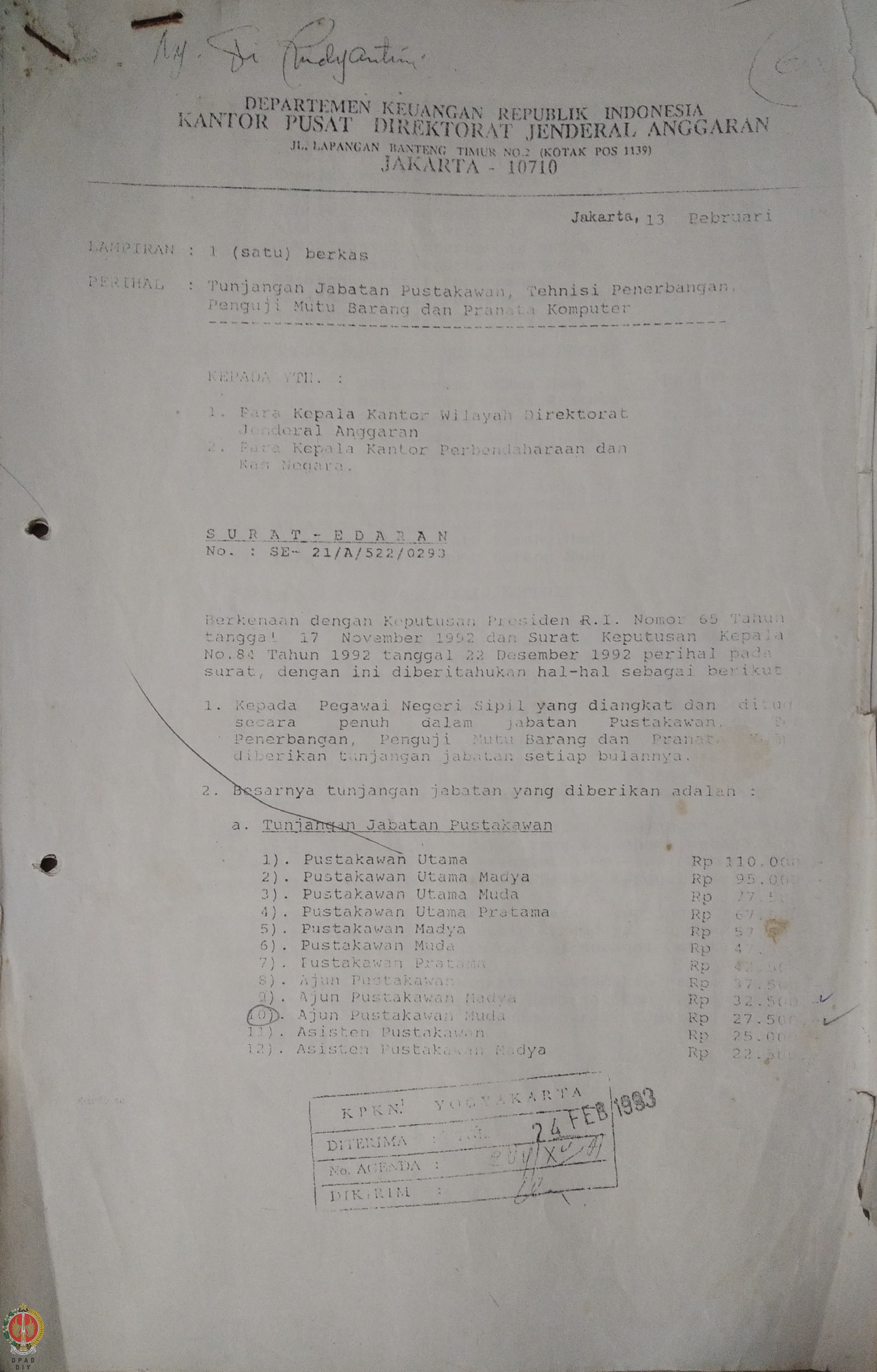 Surat Edaran dari Kantor Pusat Direktorat Jenderal Anggaran Jakarta perihal Tunjangan Jabatan Pustakawan, Teknisi Penerbangan, Penguji Mutu Barang dan Pranata Komputer