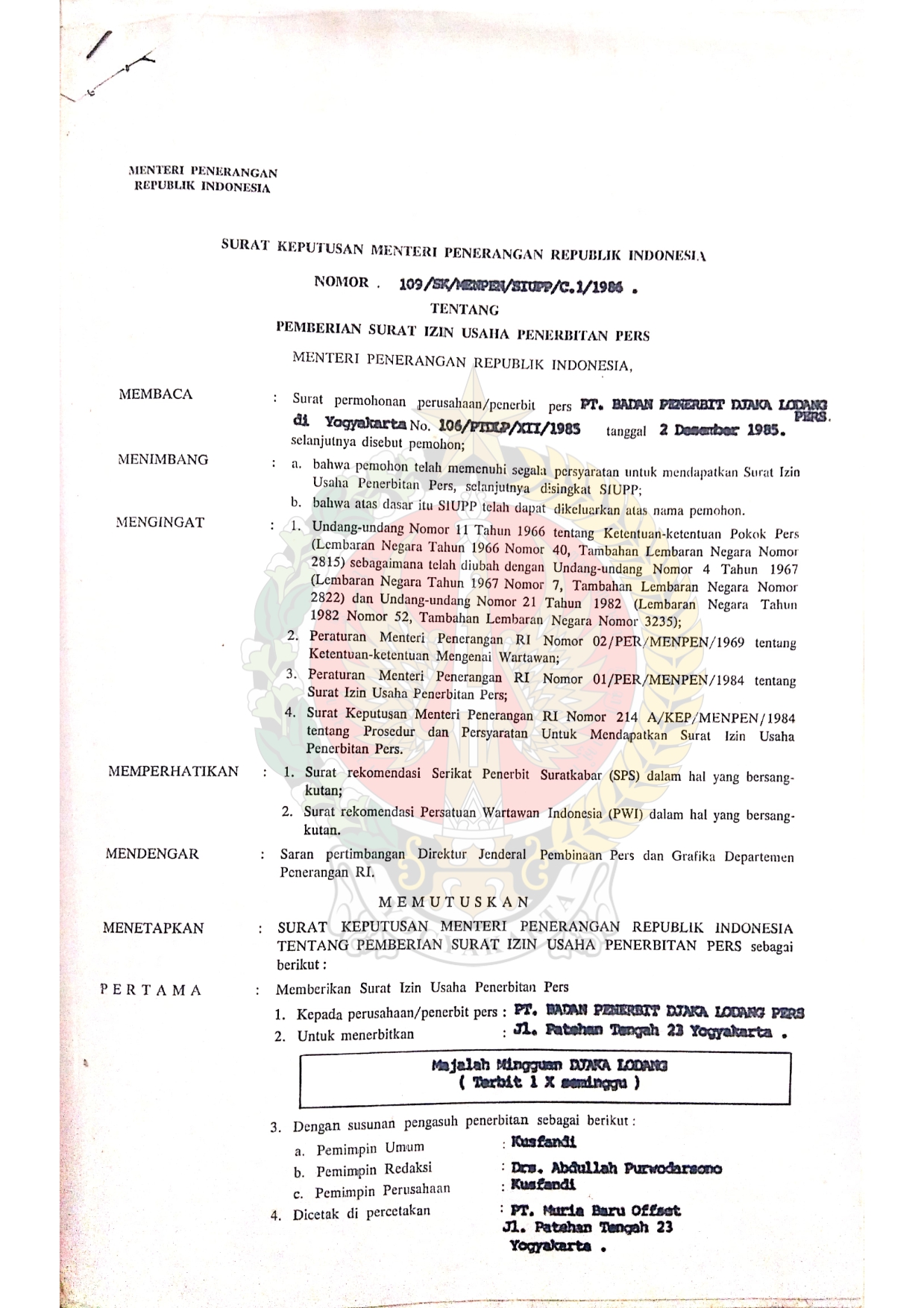 Surat Keputusan Menteri Penerangan Republik Indonesia Nomor : 1141/SK/MENPEN/ SIUPP/1966 tentang Pemberian Surat Izin Usaha Penerbitan Pers kepada Yayasan Enam Belas Desember Sembilan Delapan untuk menerbitkan Malioboro Pos.