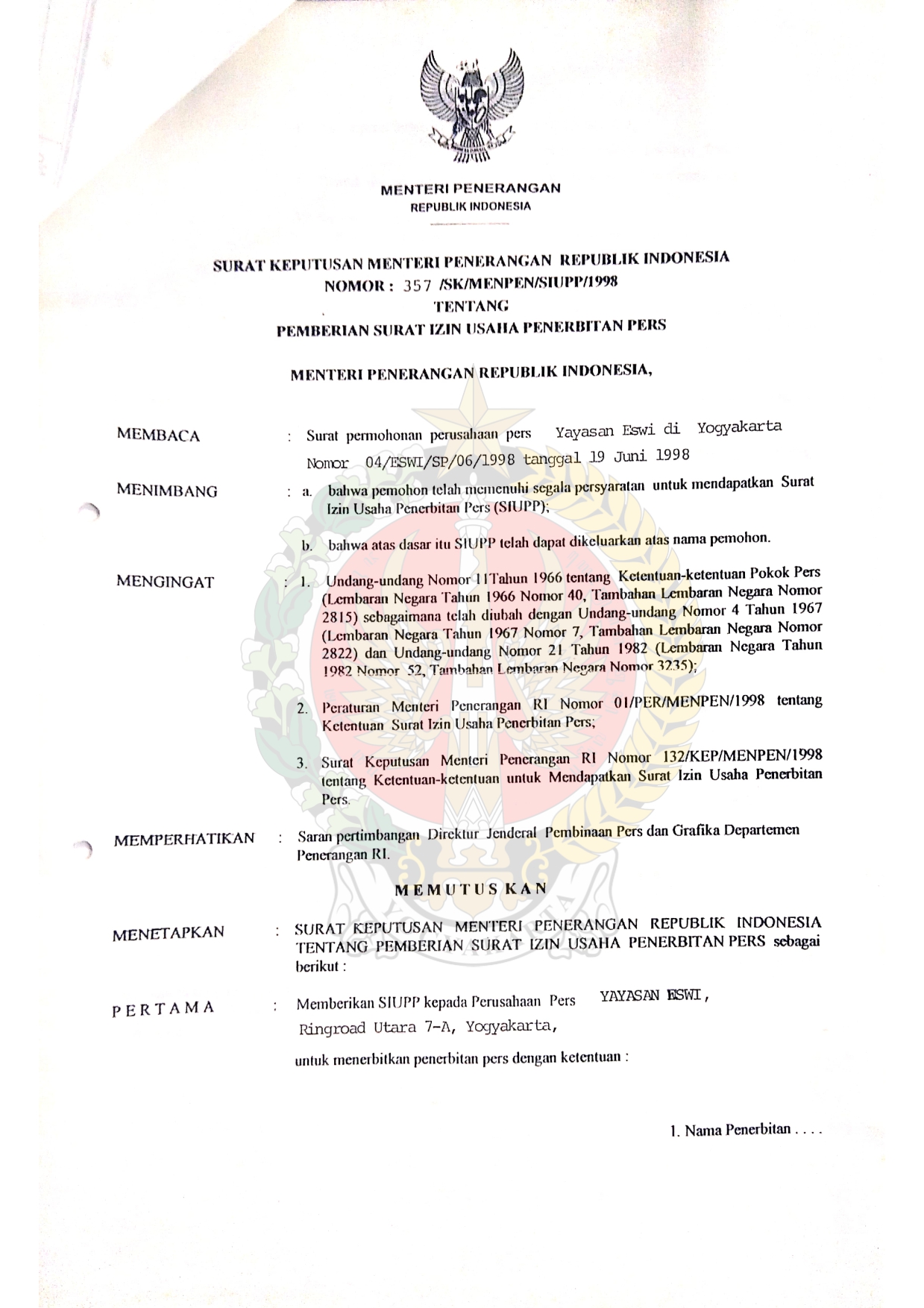 Keputusan Menteri Penerangan Republik Indonesia Nomor : 060/SK/DPHM/SIT/1966 tentang pemberian izin terhadap Penerbitan Surat Kabar Harian Sulur Indonesia Edisi Daerah Istimewa Yogyakarta oleh Menteri Penerangan u.b. Kepala Direktorat Pers dan Hubungan Masyarakat.