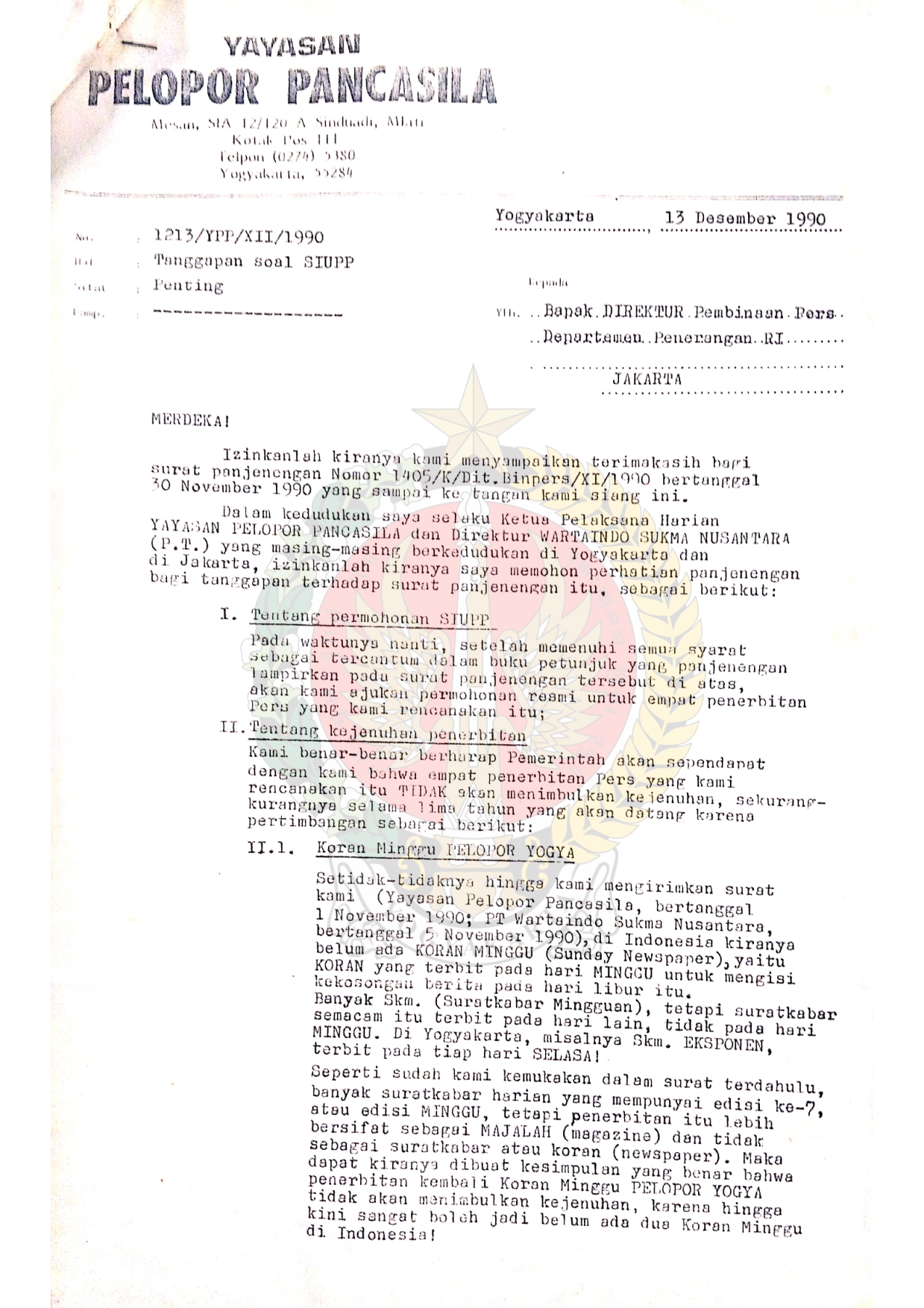 Surat dari Ketua Pelaksana Harian Yayasan Pelopor Pancasila Yogyakarta kepada Direktorat Pembinaan Pers Departemen Penerangan Republik Indonesia perihal permohonan tanggapa soal Surat Izin Usaha Penerbitan Pers.