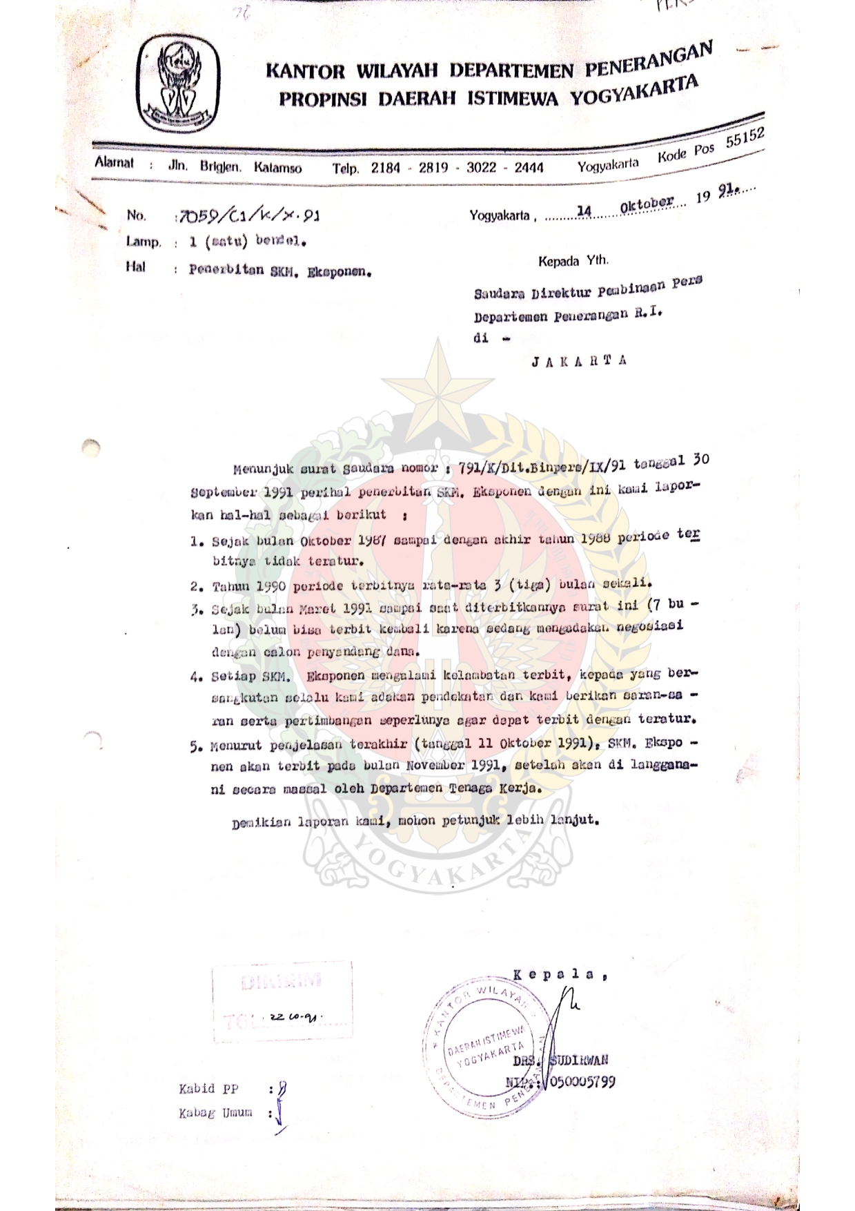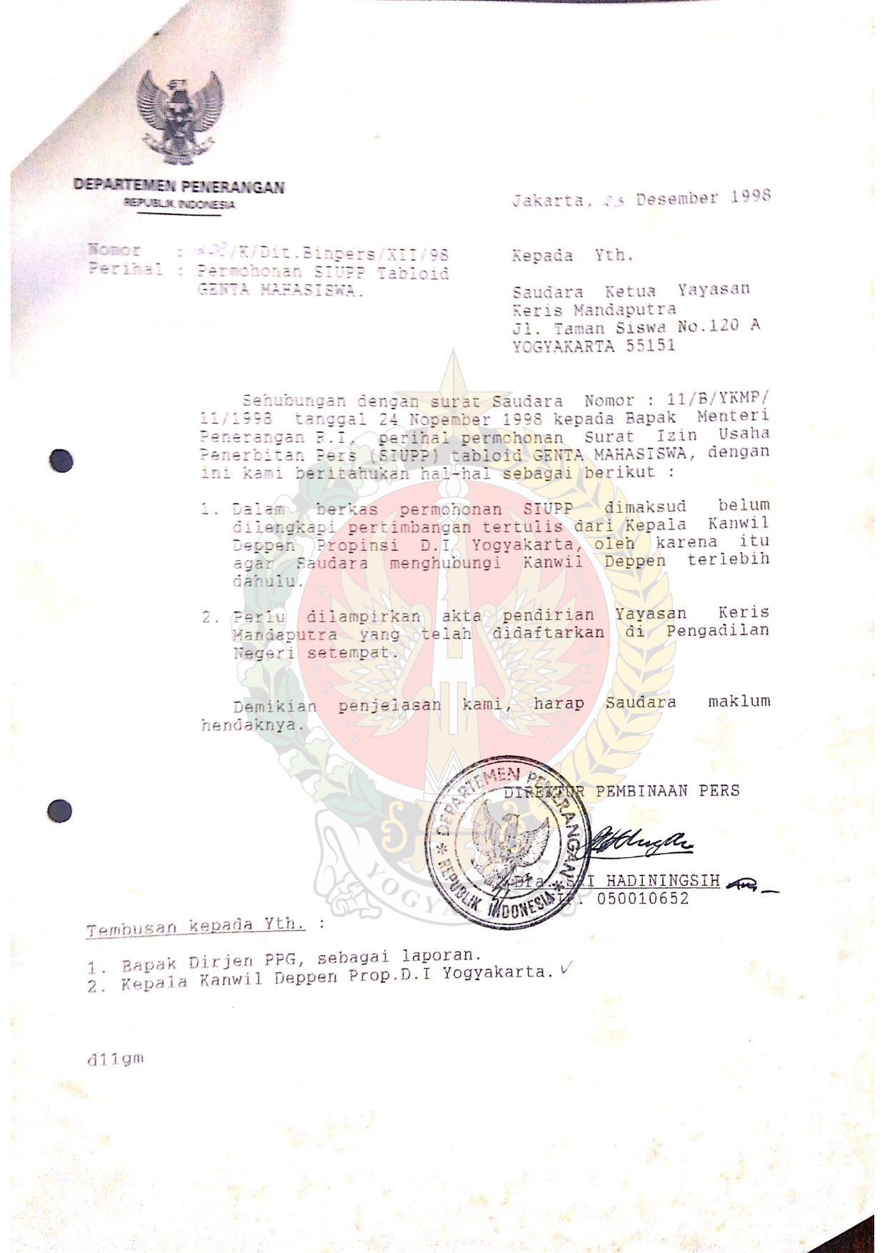 Surat dari Direktur Pembinaan Pers Departemen Penerangan Republik Indonesia kepada Ketua Yayasan Keris Mandaputra perihal permohonan Surat Izin Usaha Penerbitan Pers Tabloid Genta Mahasiswa belum dilengkapi pertimbangan tertulis dari Kepala Kantor Wilayah Departemen Penerangan Daerah Istimewa Yogyakarta dan perlu dilampirkan Akta Pendirian Yayasan Keris Mandaputra.