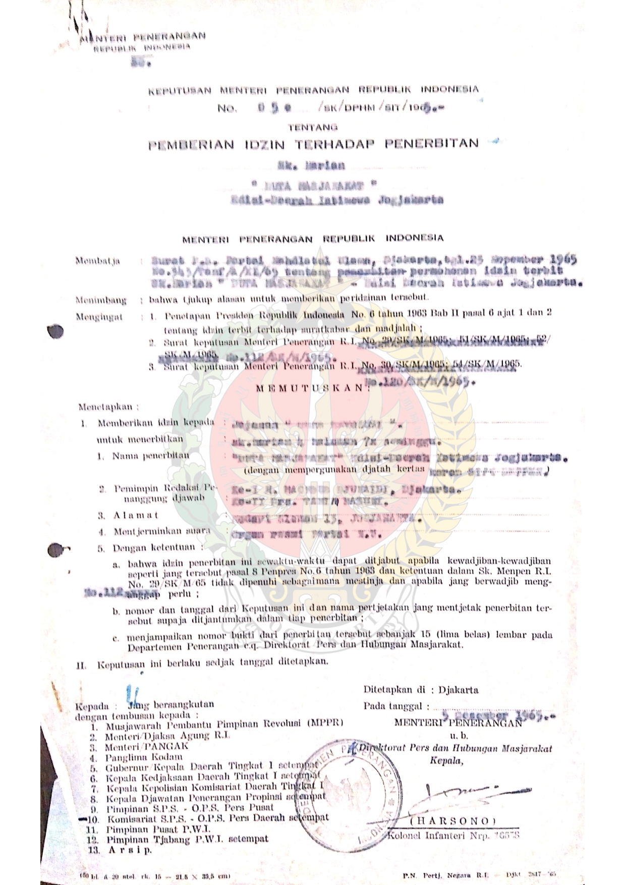 Keputusan Menteri Penerangan Republik Indonesia Nomor : 050/SK/DPHM/SIT/1965 tentang Pemberian Izin Terhadap Penerbitan Surat Kabar Harian Duta Masyarakat Edisi Daerah Istimewa Yogyakarta oleh Menteri Penerangan u.b. Kepala Direktorat Pers dan Hubungan Masyarakat.