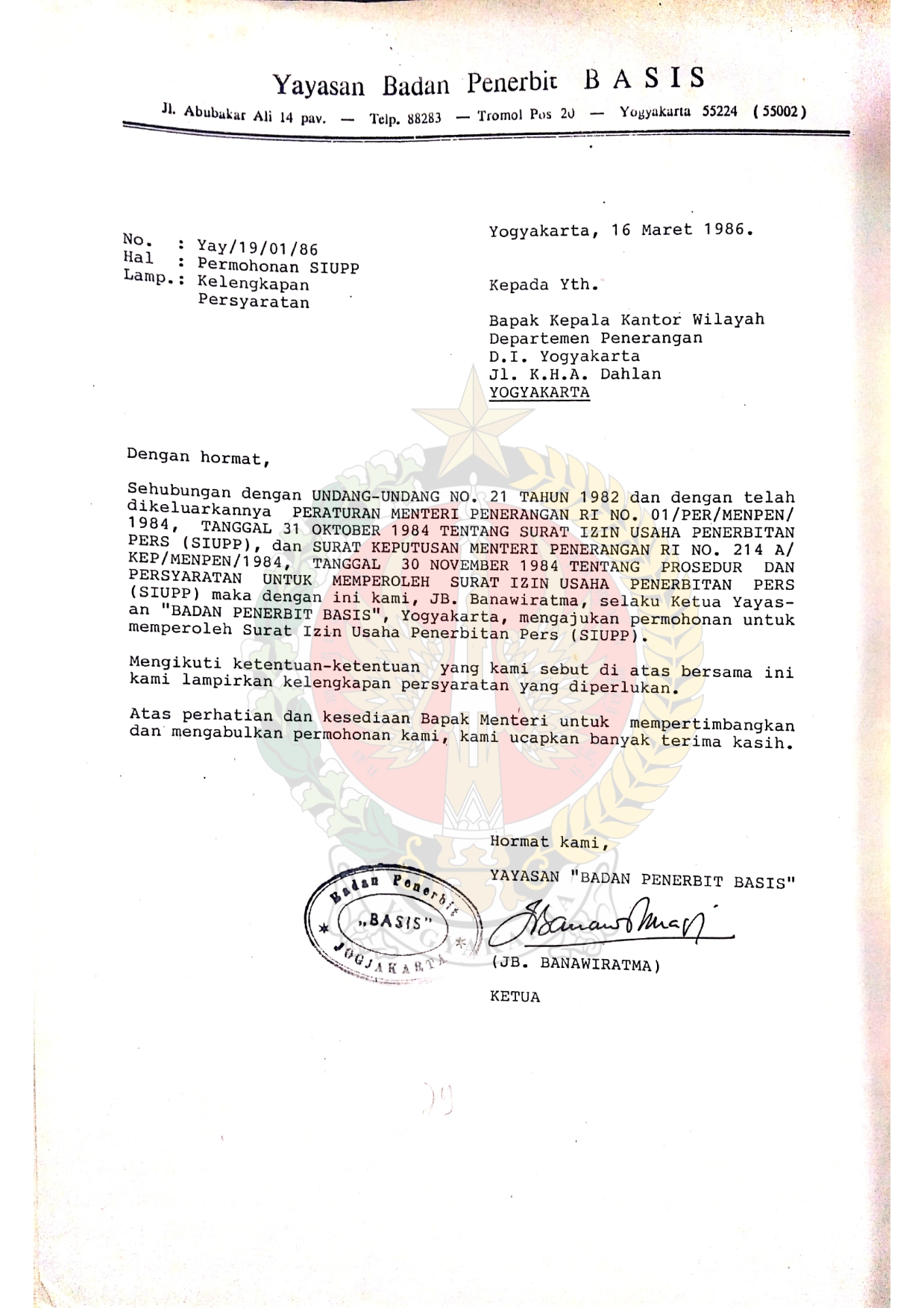 Berkas Surat dari Yayasan Penerbitan Basis Yogyakarta kepada Kepala Kantor Wilayah Departemen Penerangan Daerah Istimewa Yogyakarta perihal Permohonan Surat Izin Usaha Penerbitan Pers, beserta lampiranya.