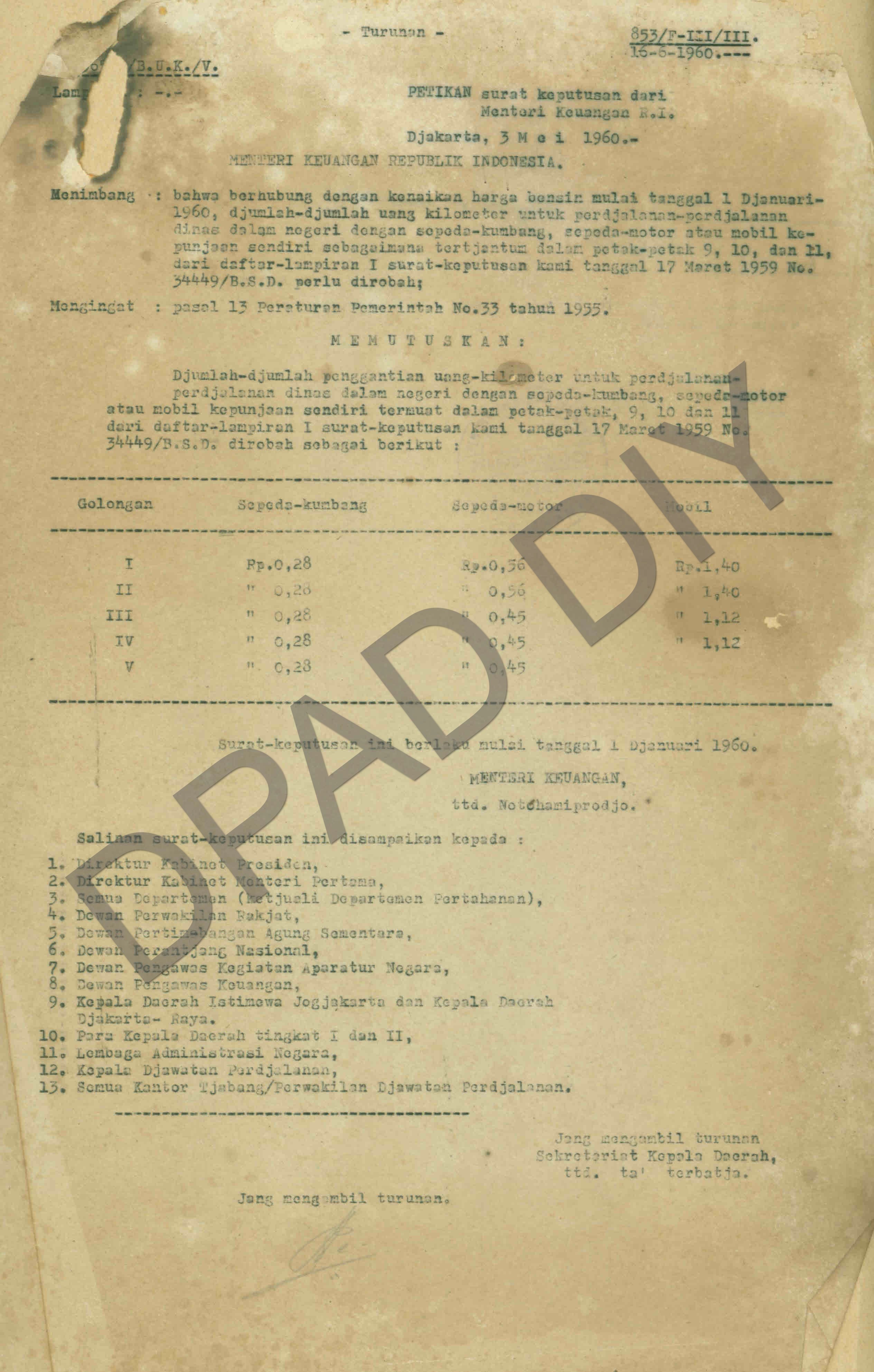 Surat Keputusan Menteri Dalam Negeri RI perihal jumlah penggantian uang kilometer untuk perjalanan dinas dalam negeri dengan sepeda kumbang, sepeda motor atau mobil kendaraan pribadi