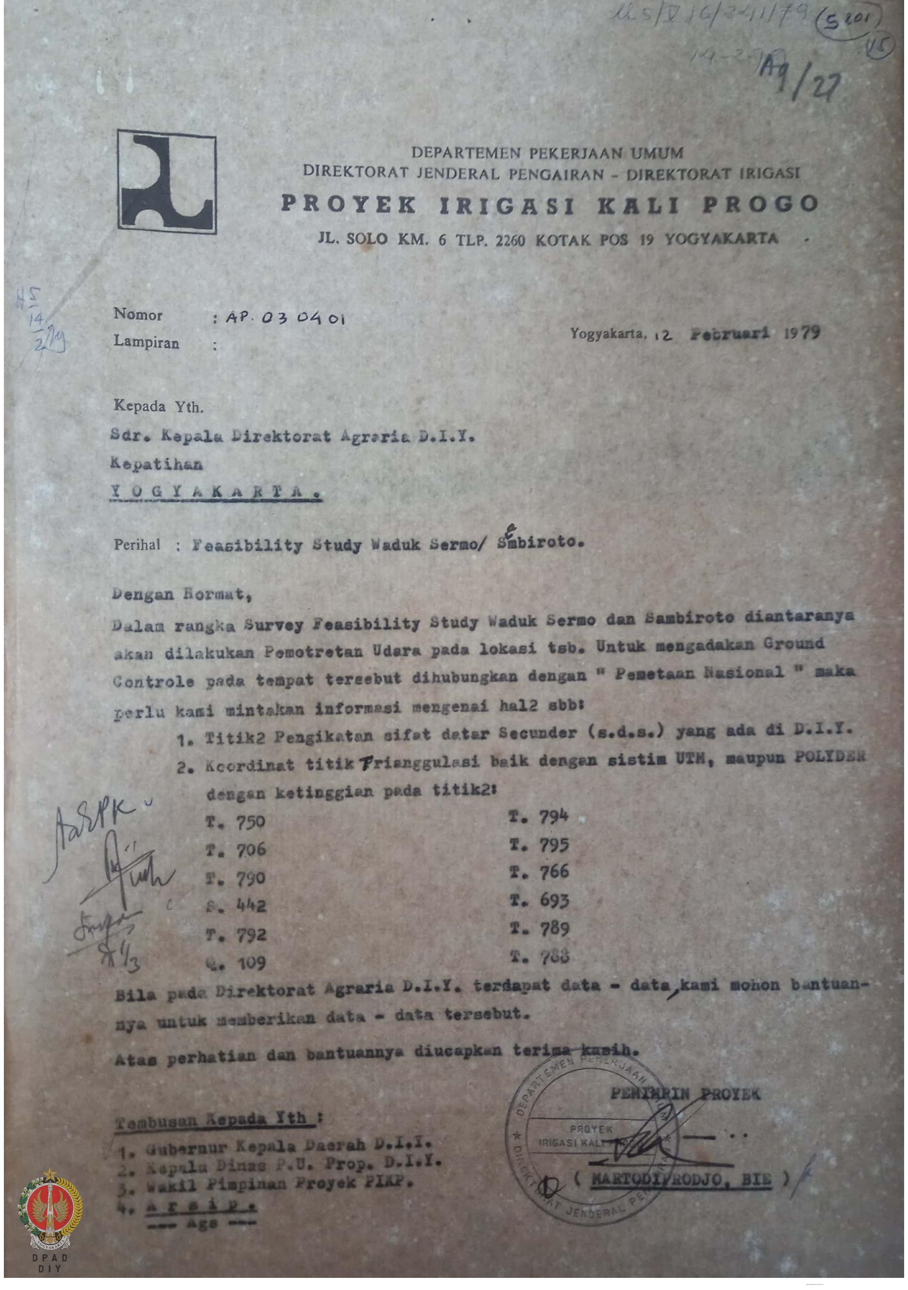 Surat No. AP. 030401 dari Proyek Irigasi Kali Progo kepada Gubernur DIY tentang survey waduk Sermo dalam rangka pemotretan udara