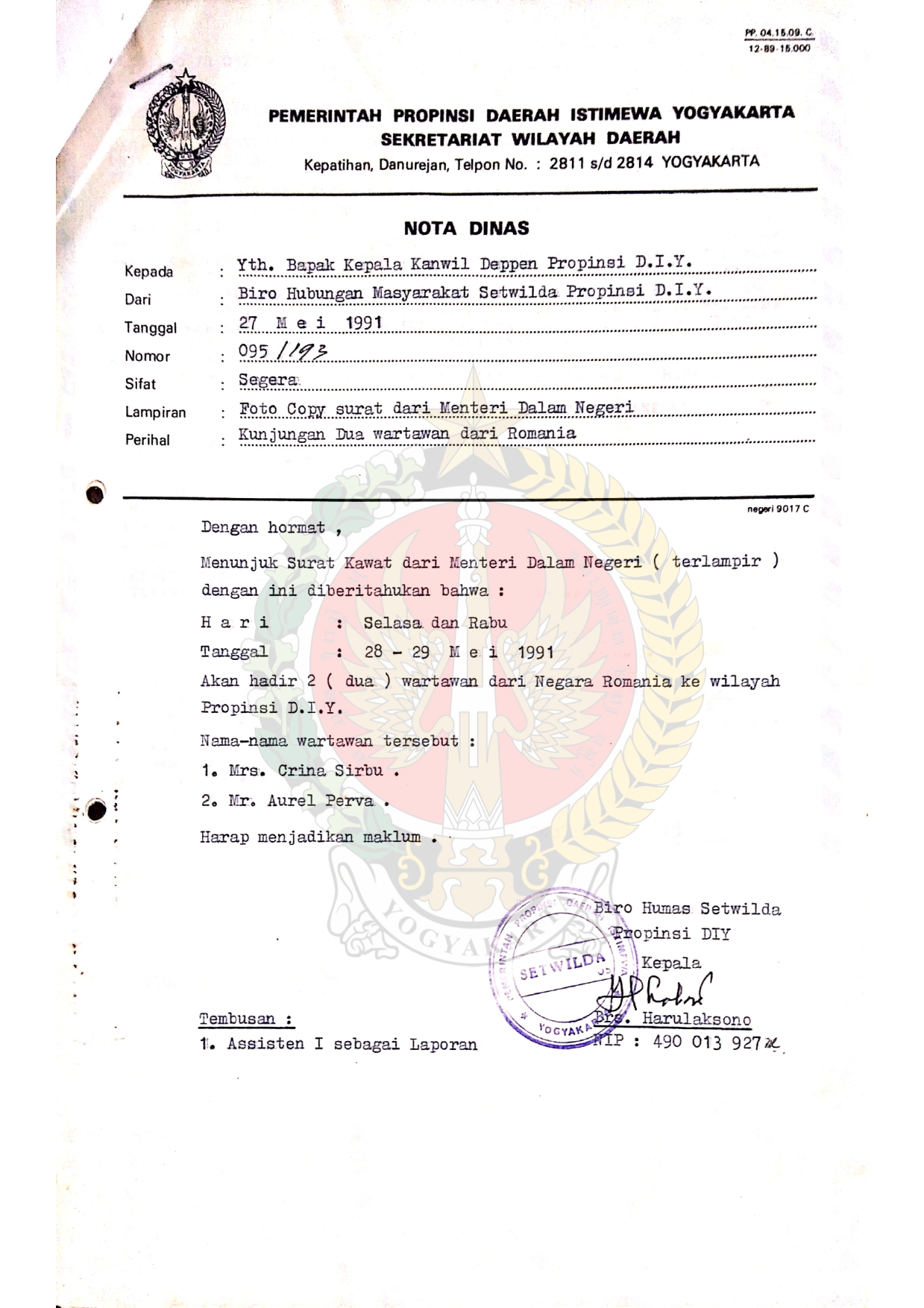Surat (Nota Dinas) dari Kepala Biro Humas Setwilda kepada Kepala Kantor Wilayah Departemen Penerangan Provinsi Daerah Istimewa Yogyakarta perihal kunjungan dua wartawan dari Romania ke Yogyakarta atas nama Mrs. Crina Sirbu dan Mr. Aurel Perva, beserta lampirannya.